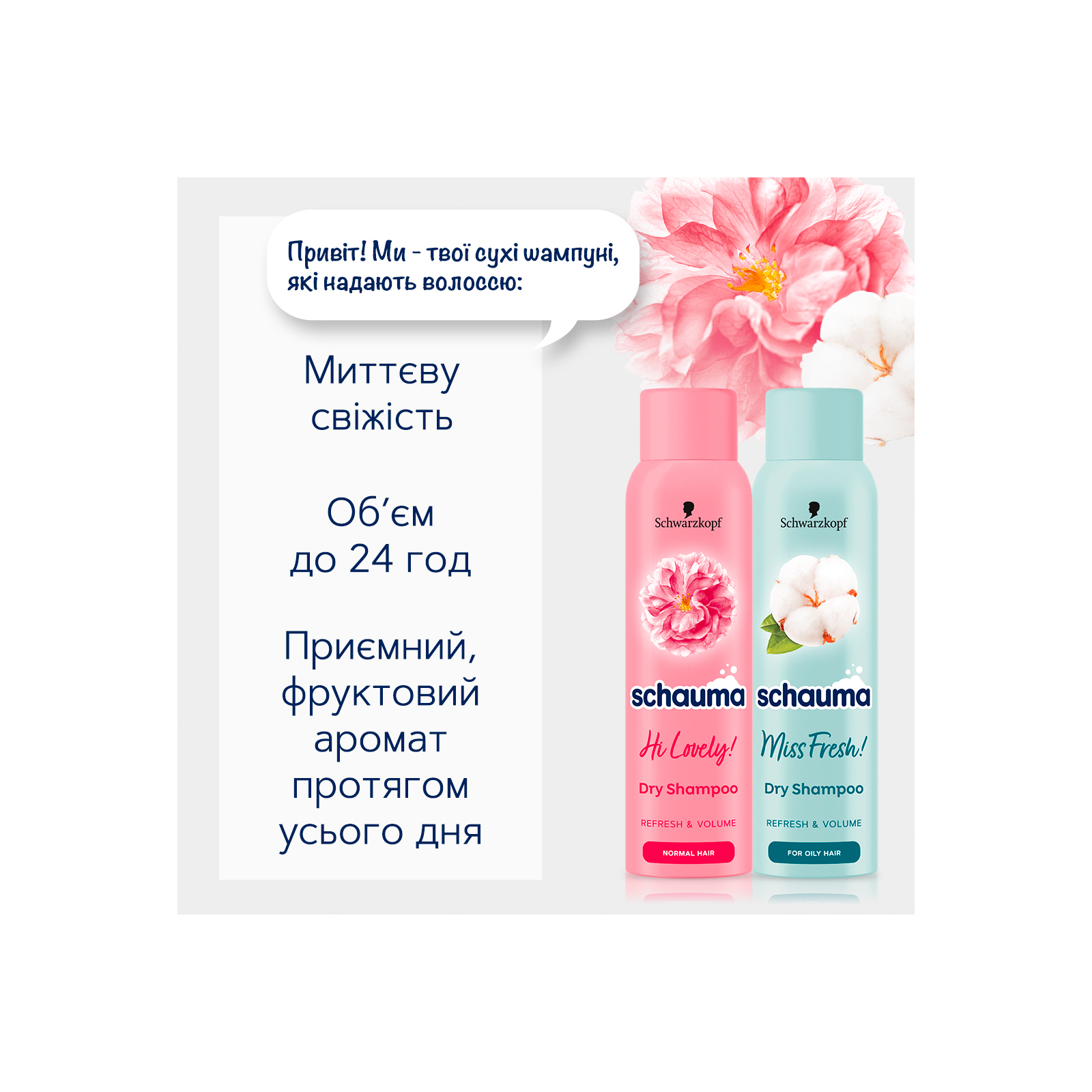 Сухий шампунь Schauma Miss Fresh! надає миттєвої свіжості та прекрасного аромату волосся протягом усього дня і до 24 годин об'єму, не залишаючи видимих слідів після розчісування.