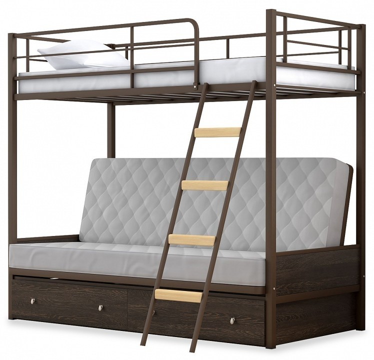 Длина спального места, мм: 1850, 1900, Ширина спального места, мм: 1260, 900, Механизм трансформации: книжка, Цвет обивки: светло-серый, Материал фасада: ЛДСП Е1, Материал обивки: рогожка, Наполнитель: ППУ 22й плотности, Материал покрытия корпуса: краска порошковая, Материал корпуса: ЛДСП Е1, сталь, Тип поверхности корпуса: матовый, Художественное описание товара: Двухъярусная кровать-диван Дакар 2. Корпус выполнен из прочного металла, покрытого порошковой краской. Основание под матрас сварное, ламели металлические профиль 30х15 мм. Каждый ярус выдержит нагрузку до 150 кг. Ножки кровати имеют пластиковые заглушки. Лестница с деревянными накладками при сборке может быть установлена с любой стороны. Цепляется к каркасу надежными крюками, при этом легко снимается и ставится на место. Раскладке дивана не мешает. Механизм разкладки - книжка. Верхнее спальное место 1900х900 мм., нижнее в разложенном виде 1850x1250 мм. Комплектуется выдвижными ящиками, материал - ЛДСП 16 мм. Нижний диван входит в стоимость изделия., Дополнительные параметры: расстояние между ярусов - 980 мм, высота ограничительного бортика - 400 мм, ширина проема на втором ярусе - 460 мм, расстояние между перекладинами лестницы - 227 мм, ширина лестницы - 340 мм, высота ножек - 250 мм, Цвет корпуса: венге, коричневый, Цвет фасада: венге, Основной цвет мебели: древесина коричневая темная венге