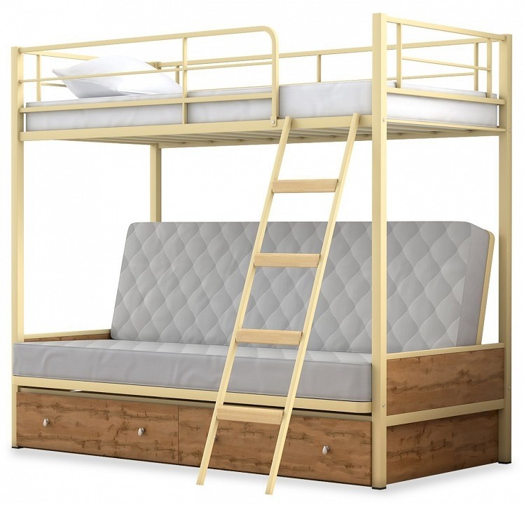 Длина спального места, мм: 1850, 1900, Ширина спального места, мм: 1260, 900, Механизм трансформации: книжка, Цвет обивки: светло-серый, Материал фасада: ЛДСП Е1, Материал обивки: рогожка, Наполнитель: ППУ 22й плотности, Материал покрытия корпуса: краска порошковая, Материал корпуса: ЛДСП Е1, сталь, Тип поверхности корпуса: матовый, Художественное описание товара: Двухъярусная кровать-диван Дакар 2. Корпус выполнен из прочного металла, покрытого порошковой краской. Основание под матрас сварное, ламели металлические профиль 30х15 мм. Каждый ярус выдержит нагрузку до 150 кг. Ножки кровати имеют пластиковые заглушки. Лестница с деревянными накладками при сборке может быть установлена с любой стороны. Цепляется к каркасу надежными крюками, при этом легко снимается и ставится на место. Раскладке дивана не мешает. Механизм разкладки - книжка. Верхнее спальное место 1900х900 мм., нижнее в разложенном виде 1850x1250 мм. Комплектуется выдвижными ящиками, материал - ЛДСП 16 мм. Нижний диван входит в стоимость изделия., Дополнительные параметры: расстояние между ярусов - 980 мм, высота ограничительного бортика - 400 мм, ширина проема на втором ярусе - 460 мм, расстояние между перекладинами лестницы - 227 мм, ширина лестницы - 340 мм, высота ножек - 250 мм, Цвет корпуса: дуб ватан, слоновая кость, Цвет фасада: дуб ватан, Основной цвет мебели: древесина коричневая светлая дуб
