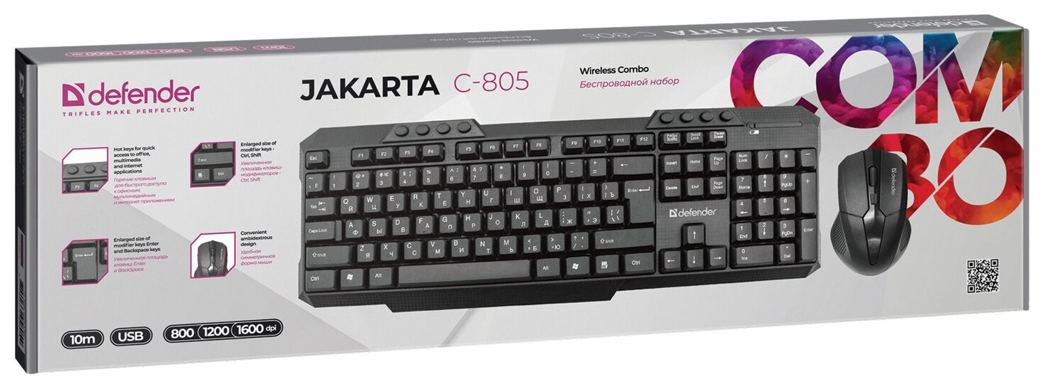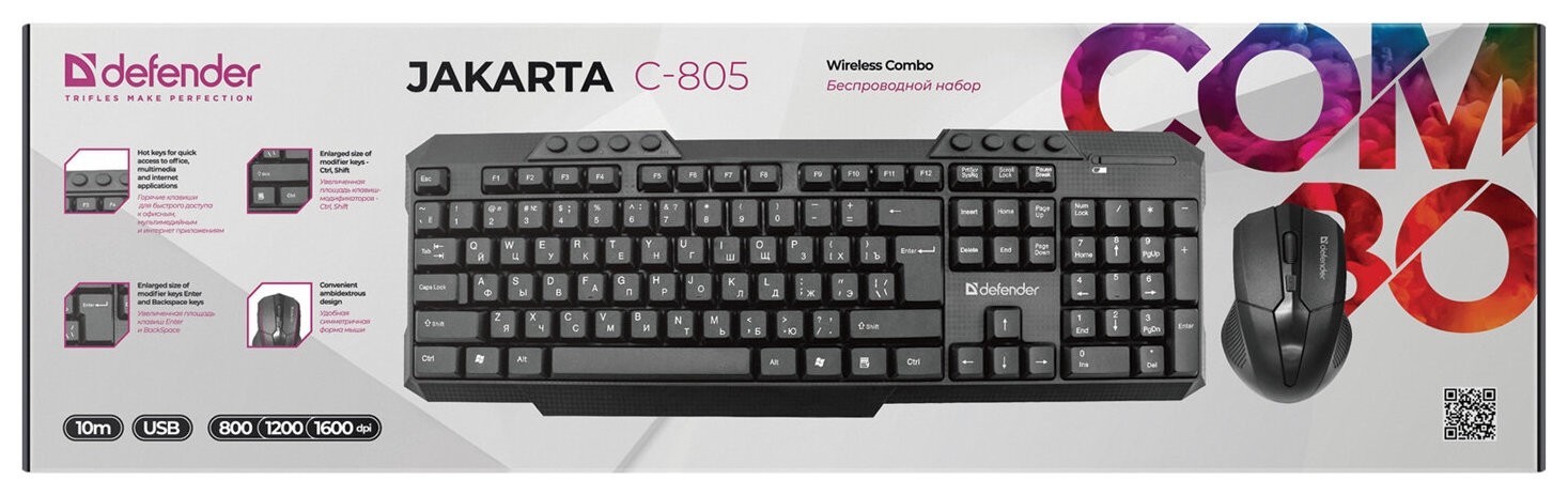 DEFENDER Jakarta C-805 - беспроводной набор с радиусом действия до 10 метров легкий и простой в установке, для работы не нужны драйверы. Удобное расположение мультимедийных клавиш и симметричная форма мыши позволят комфортно выполнять нужные задачи.
