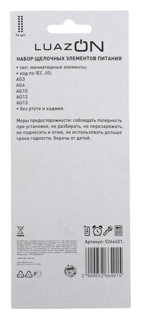 Набор алкалиновых батареек LuazON позволяет поддерживать наручные часы, калькуляторы и гирлянды в рабочем состоянии. Комплект содержит наиболее популярные миниатюрные элементы питания: AG3, AG4, AG10, AG12, AG13.
