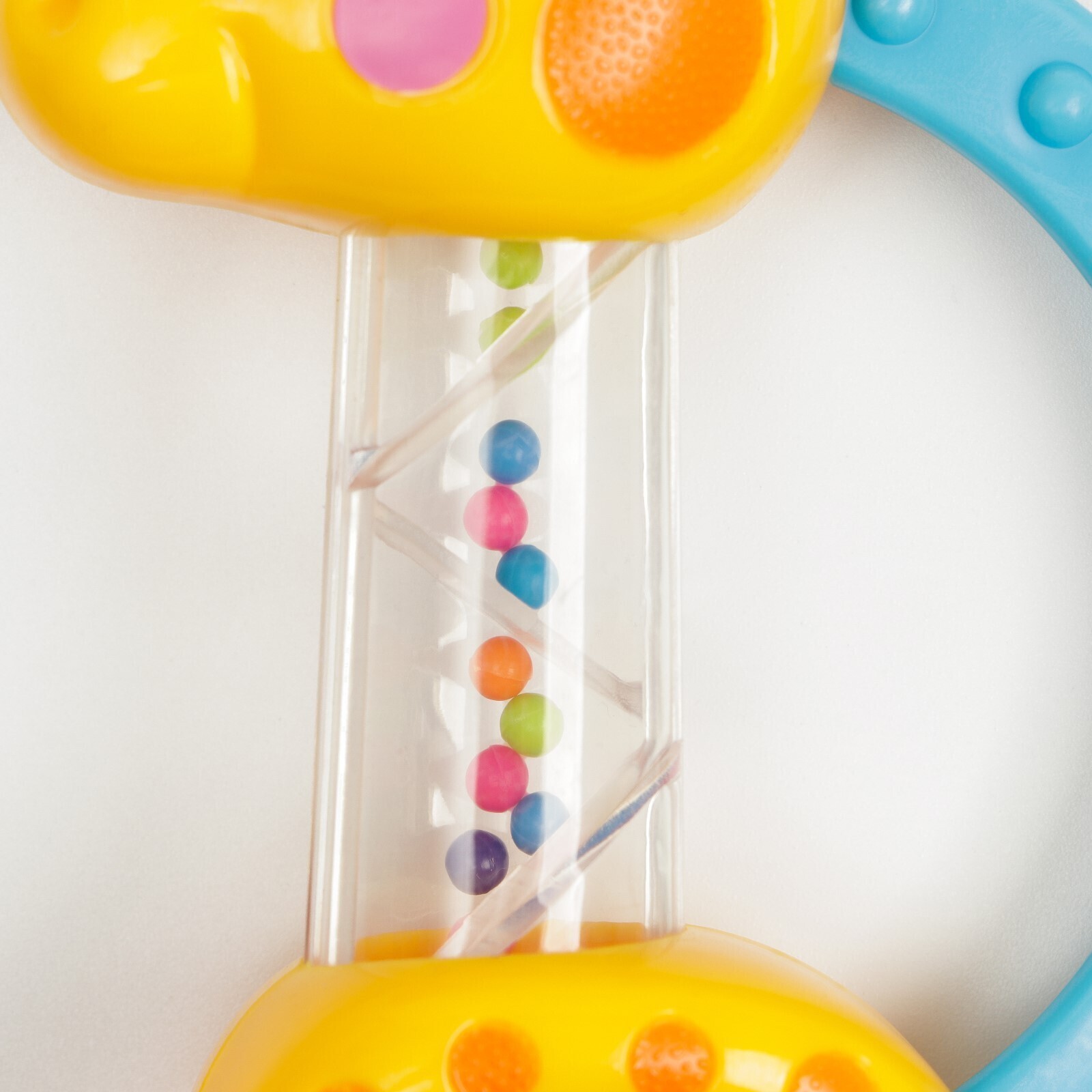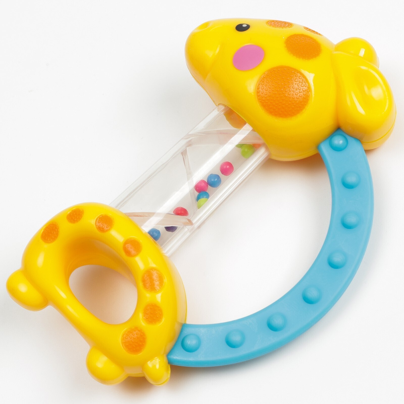 Звук в модели появляется при встряхивании. Причудливая форма надолго займёт внимание карапуза. Погремушку удобно использовать: лёгкая вещица подходит для захвата маленькими ладошками.