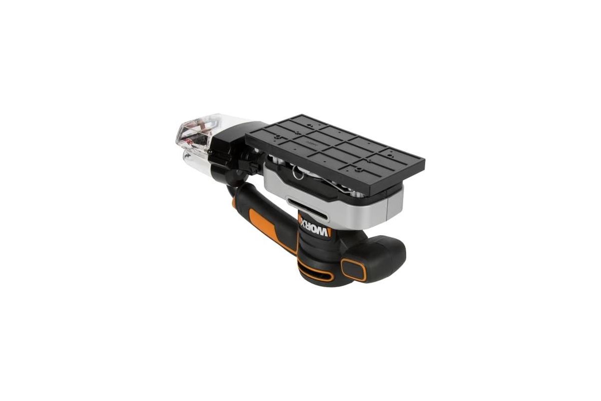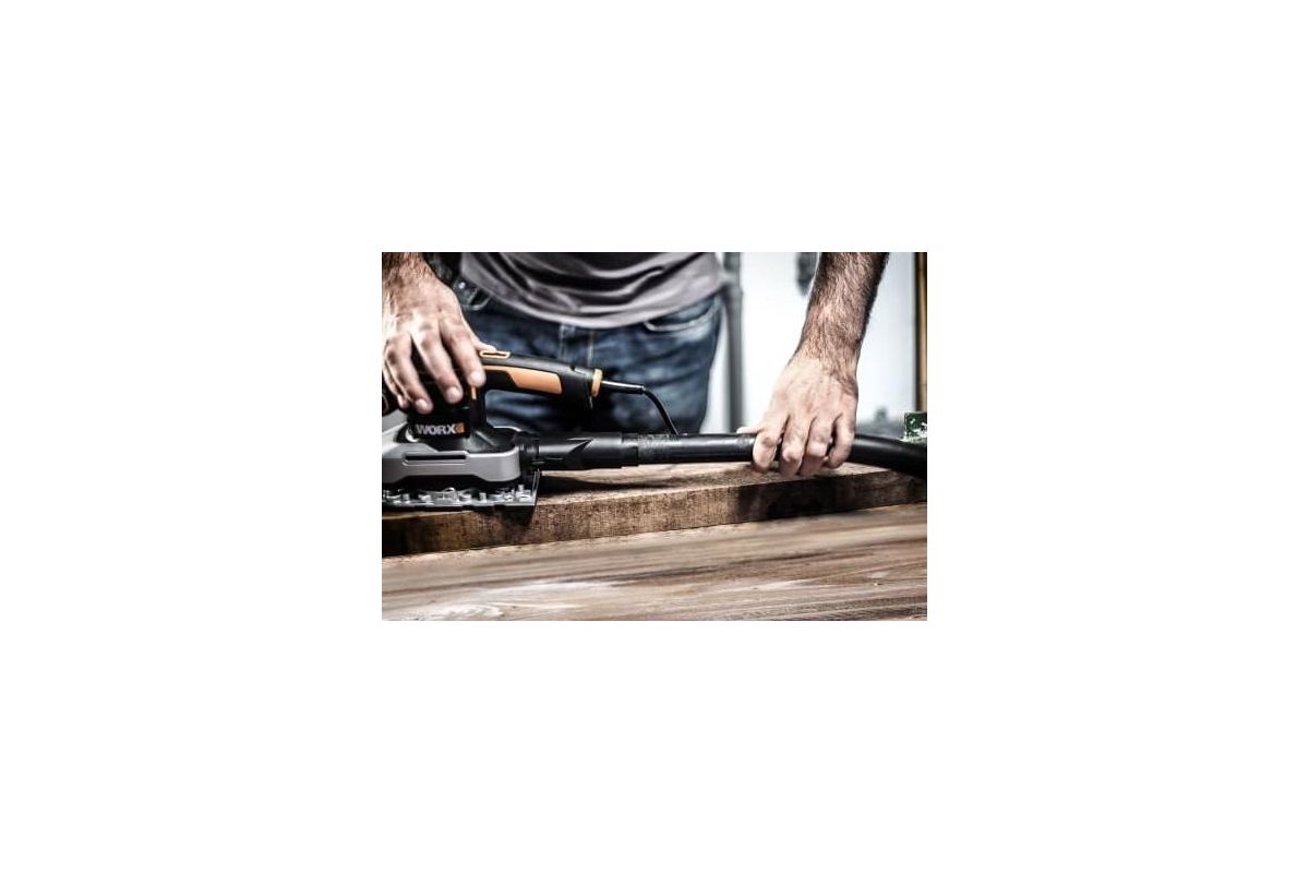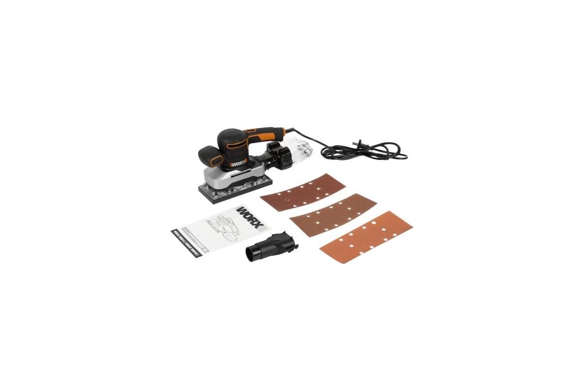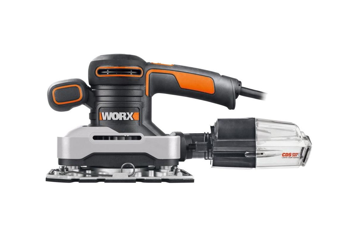 WORX WX642.1 работающий от сети 230В плоскошлифовальная машинка 1/3 мощностью 270Вт. Технология циклонного сбора пыли без мешка. Удаление пыли нажатием одной кнопки. Изменяемая скорость вращения. Алюминиевая основа. Система быстрого зажима листа hook and loop. Данная модель поставляется в кейсе