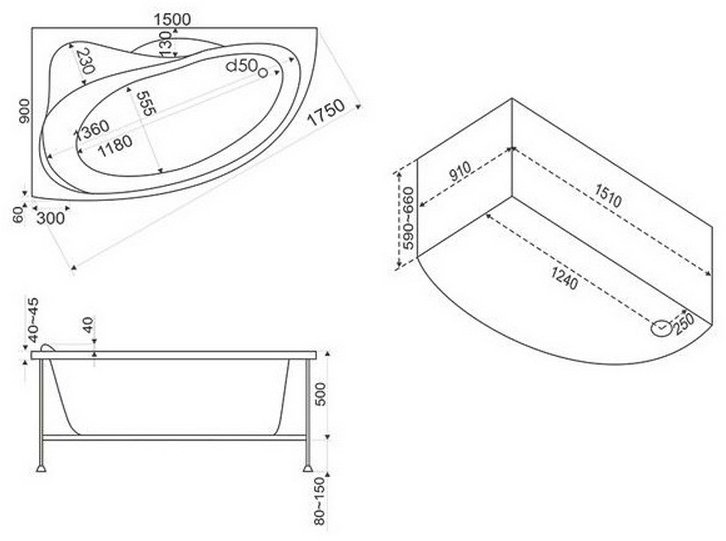 Размер ванны (ДхШхВ) - 150x90x59-66 см