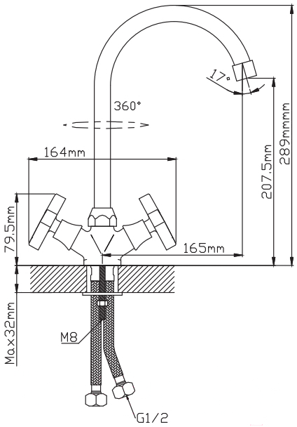 - В комплекте гибкая подводка (2 шт., 400 мм), смеситель