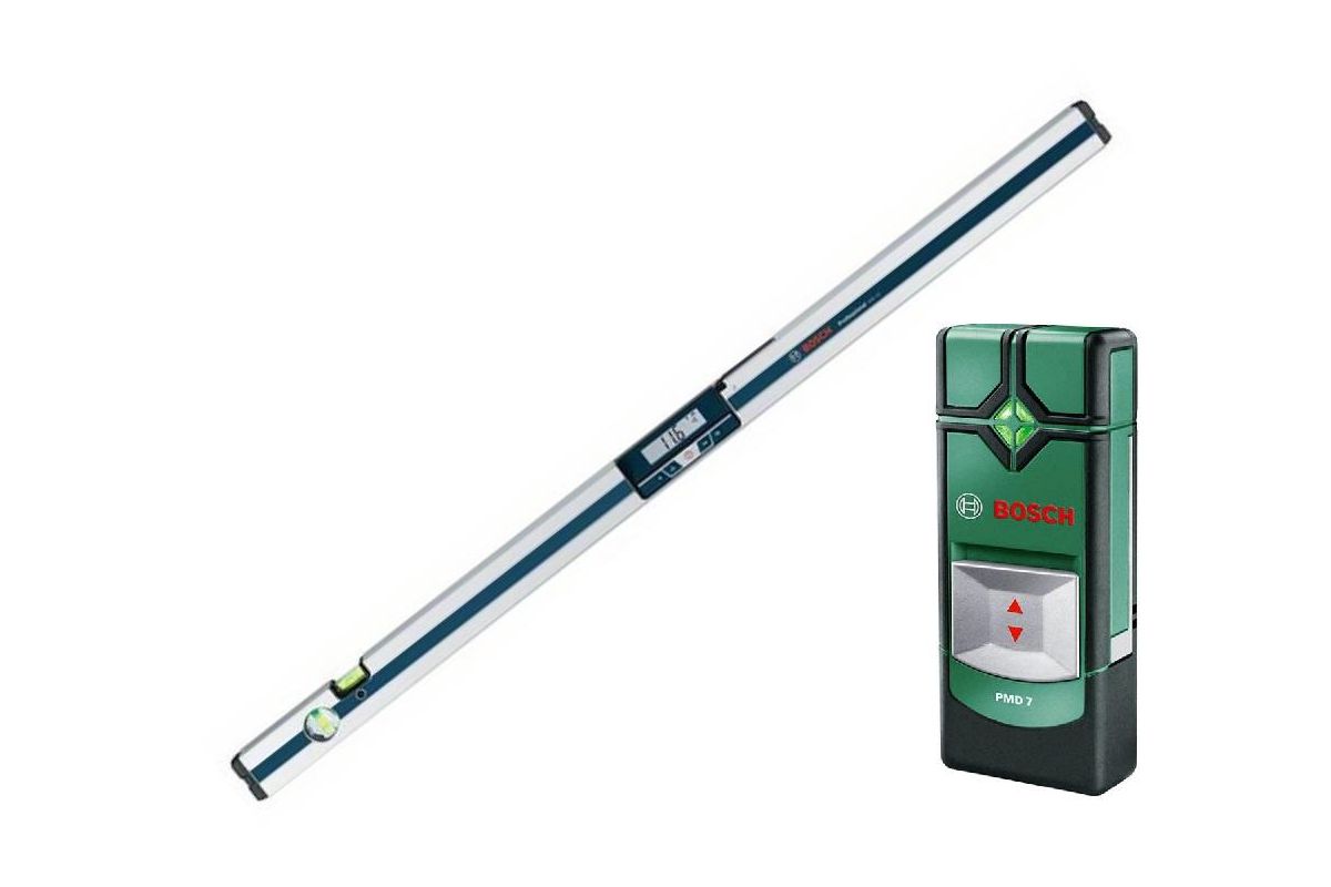 В состав набора входят: Уклономер BOSCH GIM 120 Prof (0.601.076.800) Диапазон измерения 0–360° (4x90°) Точность при 0°/90°, Детектор BOSCH PMD7 сталь-70мм медь-60мм электропроводка-50мм 3x1.5В ААА универальный