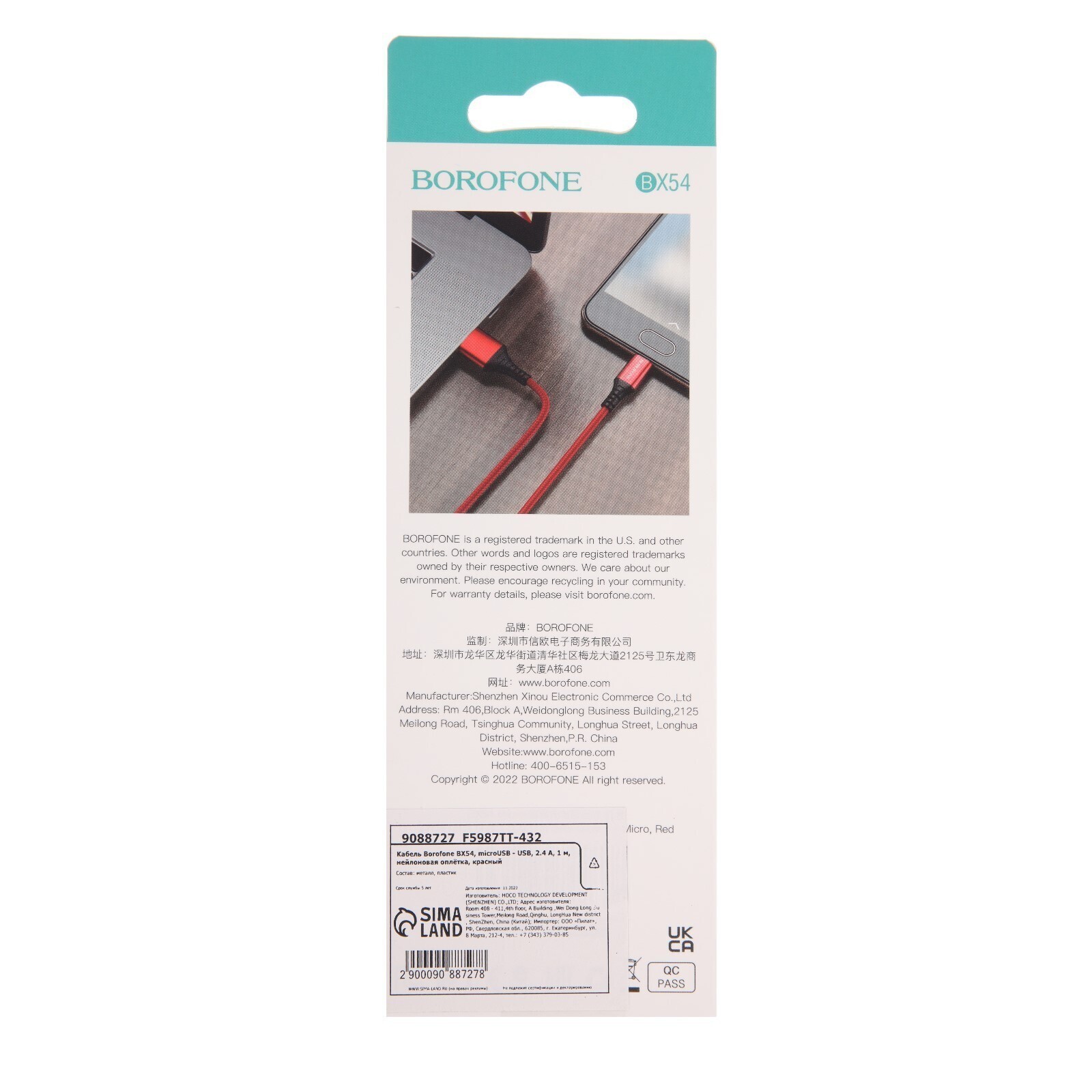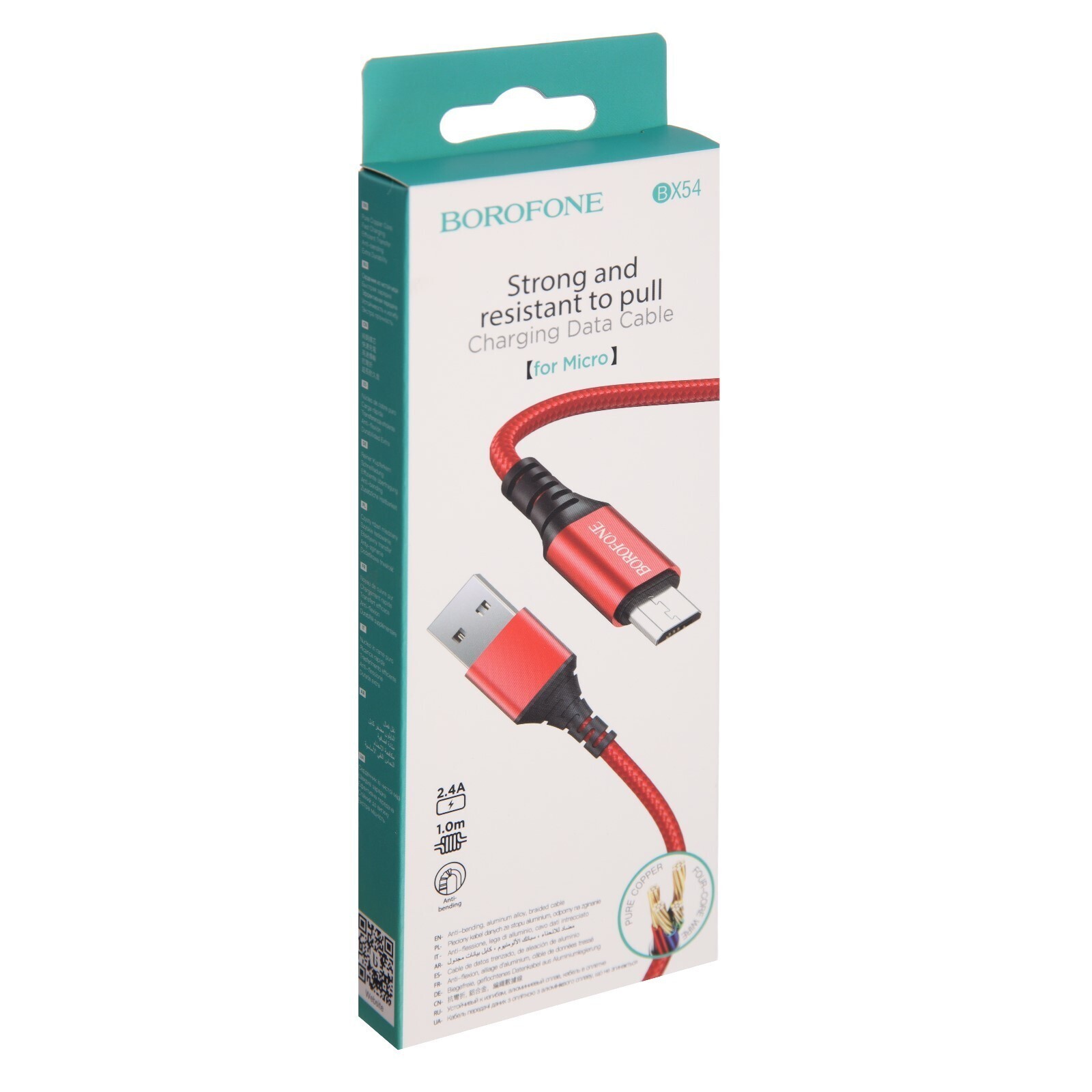 Кабель Borofone BX54, microUSB - USB, 2.4 А, 1 м, нейлоновая оплётка, красный