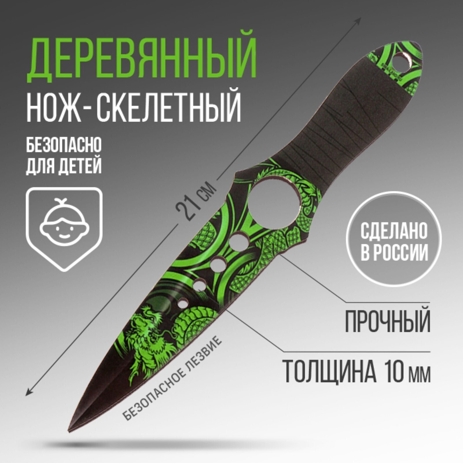 Скелетный нож из дерева не является холодным оружием, он изготовлен из фанеры высокого качества. Преимущество деревянного ножа в его прочности - он с усиленной ручкой в несколько слоёв. На детскую игрушку нанесен двухсторонний рисунок. Стильный дизайн игрушечного ножа, а также его форма притягивают внимание. О веселой и динамичной игре мальчиков можно не беспокоиться - у них в руках безопасное оружие. Сувенирный нож не имеет острых краёв и не может посадить занозу или нанести вред. Нож игрушка тщательно отшлифован, клинок не заточен! Идеален как дополнение к подарку на 23 февраля, Новый Год или день рождения.