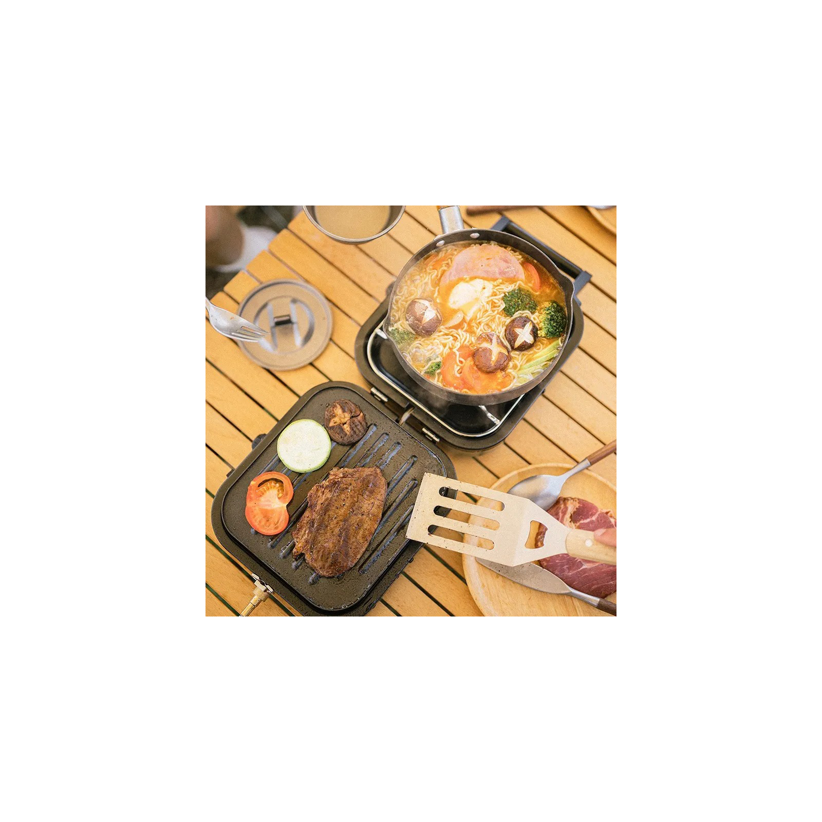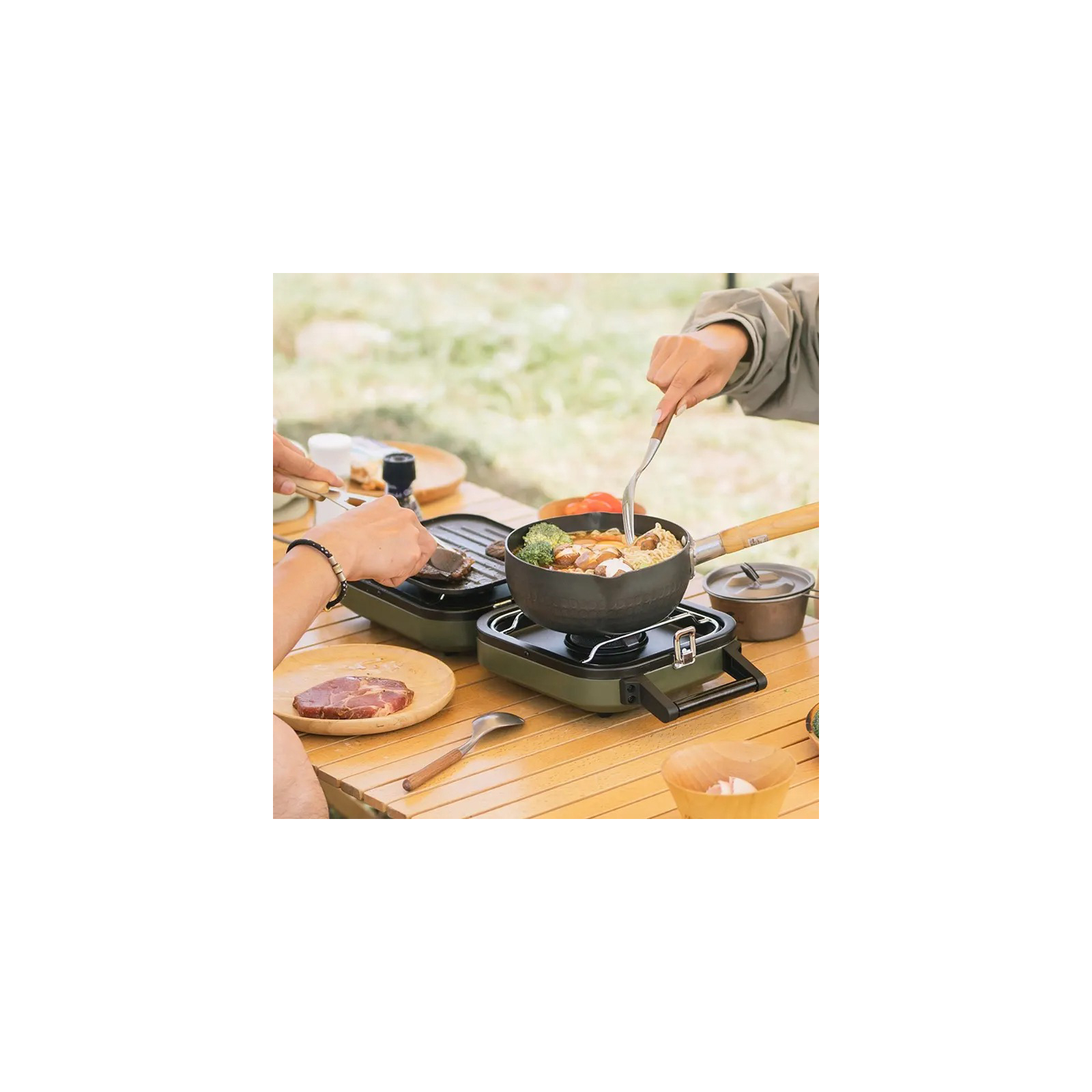 На обох пальниках є запальники та пристрої керування (збільшення/зменшення вогню). Компактна складна модель, яку легко носити з собою куди завгодно.