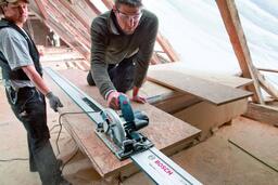 Этот инструмент профессионального уровня рассчитан на осуществление пропилов, под углом и прямых. Мощность двигателя — 1800 Вт. Преимущества: константная электроника для работы без потери мощности; электронная система регулировки скорости вращения в диапазоне от 2300 до 5000 оборотов за минуту; функция плавного пуска; возможность подключения системы пылеудаления; совместимость с шинами Bosch FSN.