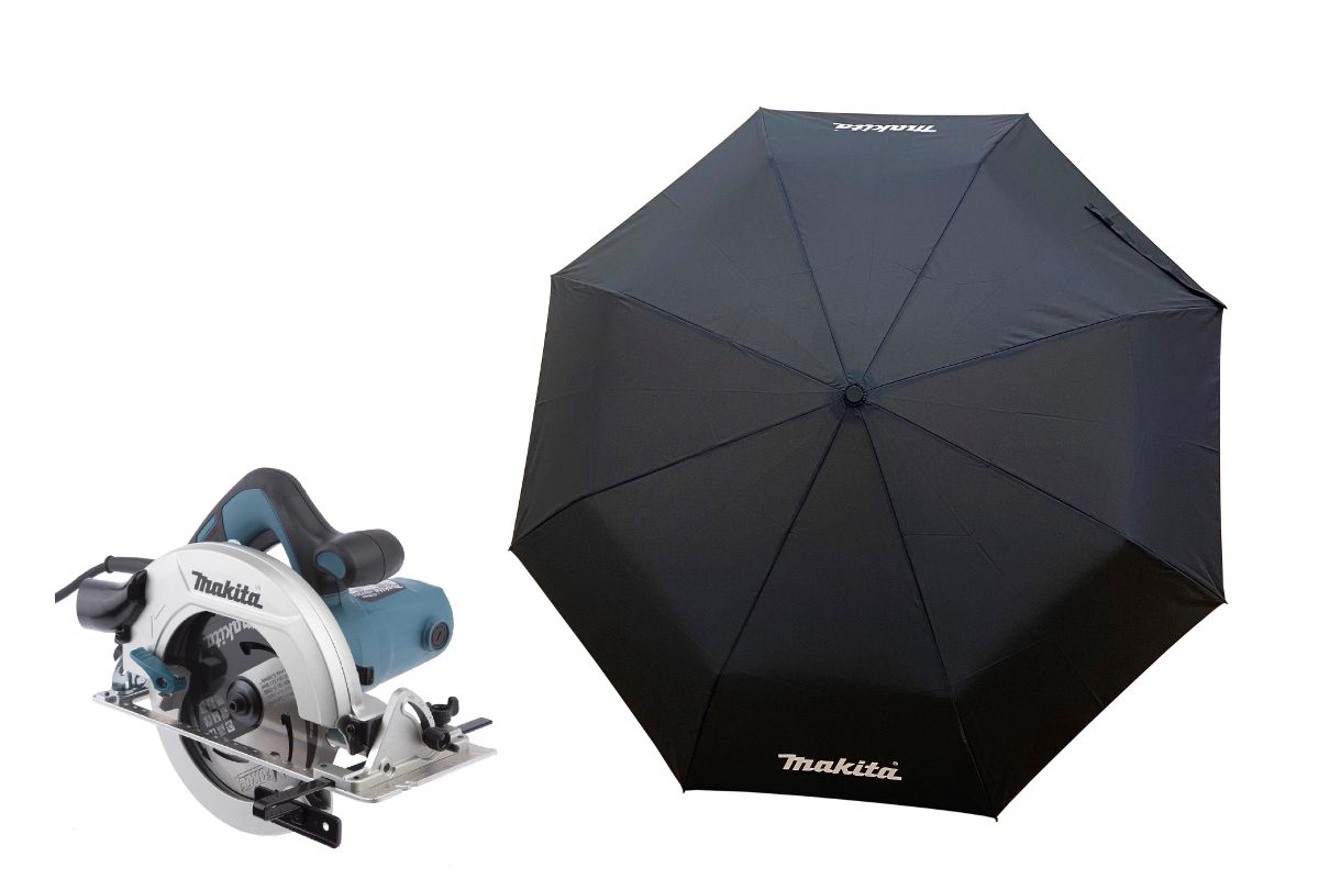 В состав набора входят: Пила циркулярная MAKITA HS7601K 1200Вт 5200об/м диск-ф190х30мм рез-66мм 4.0кг чем, Зонт складной MAKITA PGH-180150