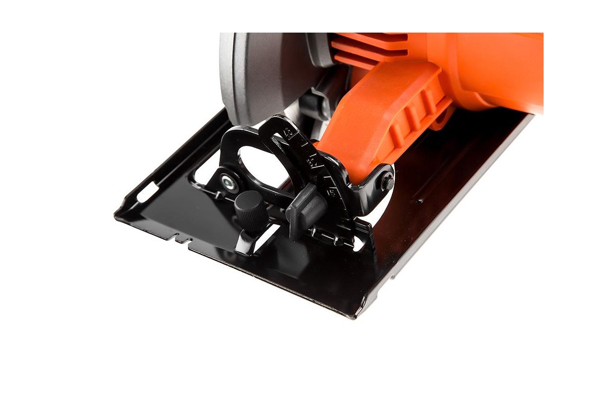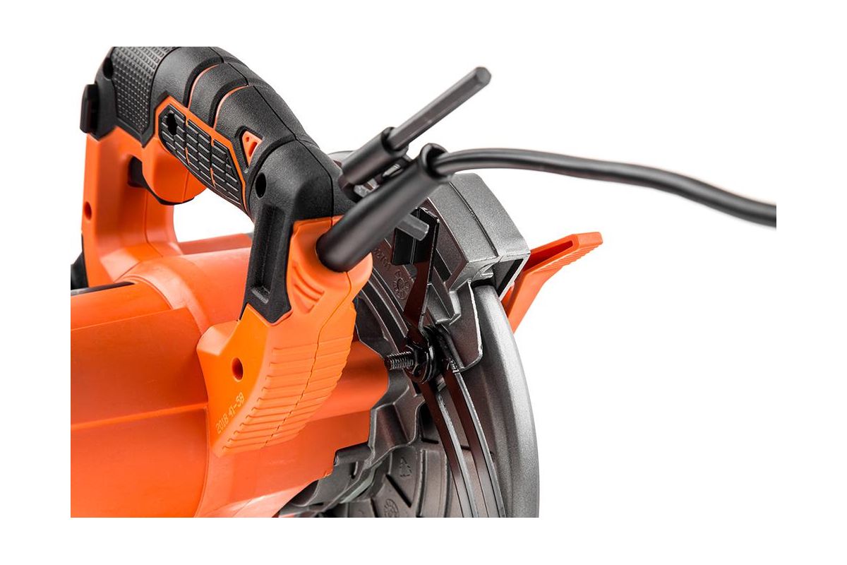 Подвижный кожух прикрывает диск, даже когда пила выключена. Мастер защищён от травм, а поверхности – от царапания.