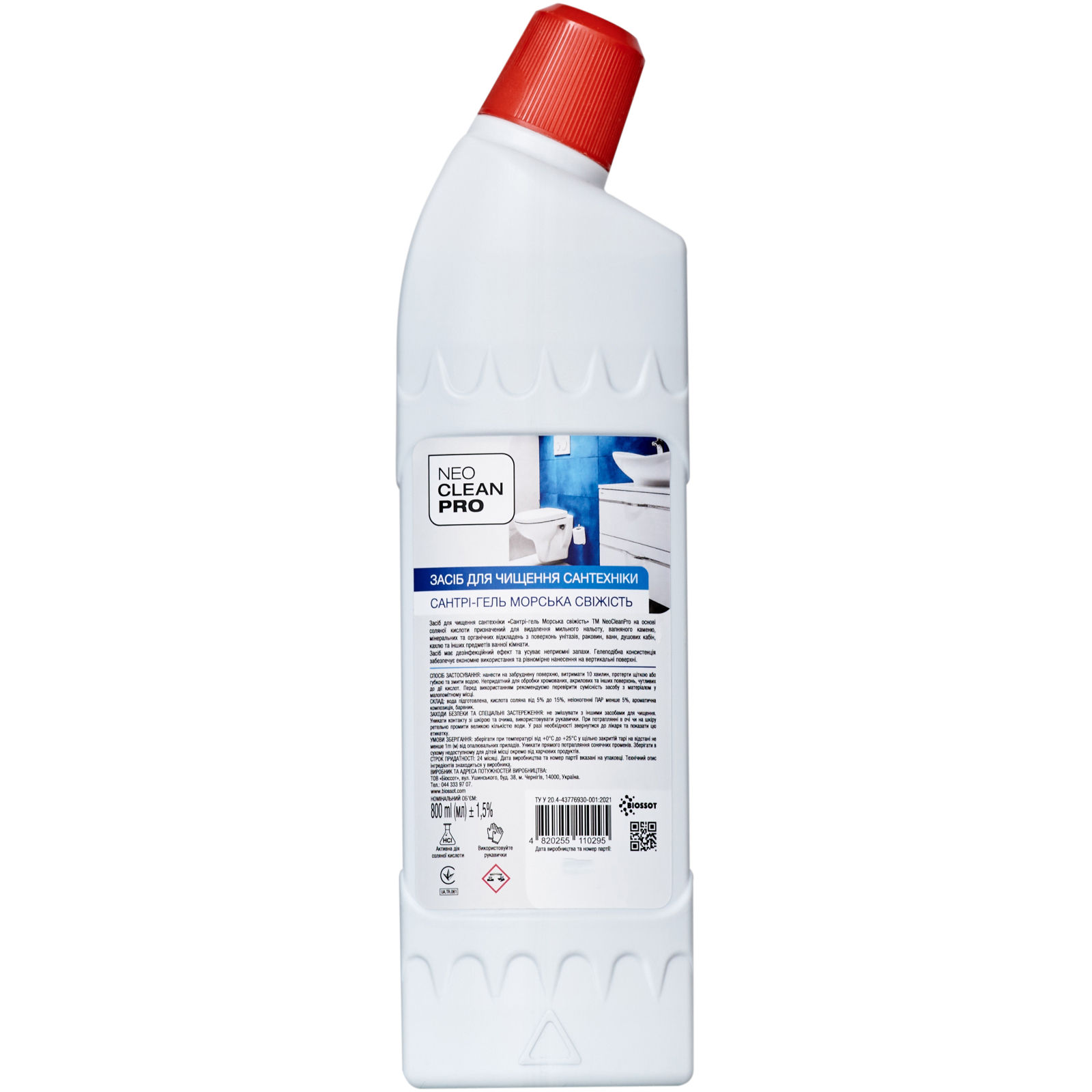 Засіб Biossot NeoCleanPro Сантрі-гель Морська свіжість на основі соляної кислоти. Призначений для видалення мильного нальоту, вапняного каменю, мінеральних та органічних відкладень з поверхонь унітазів, раковин, ванн, душових кабін, кахлю та інших предметів ванної кімнати.