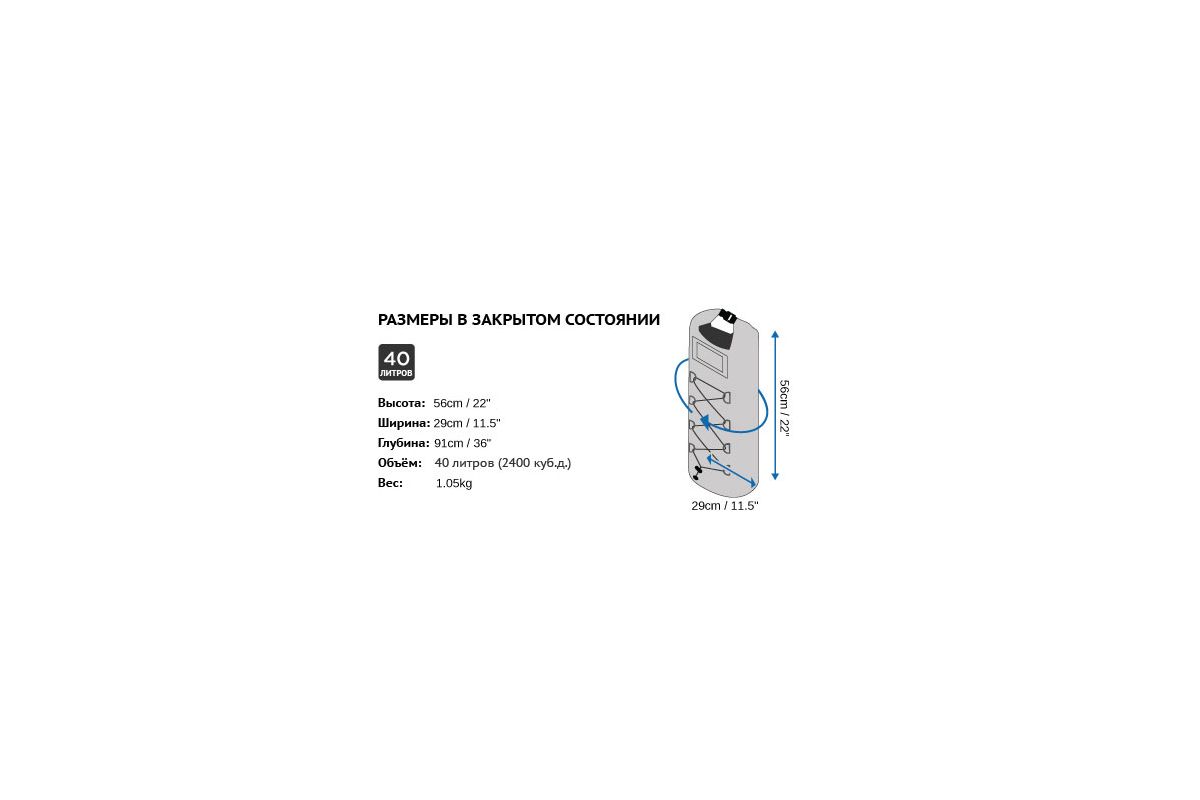 Размер: высота 560 мм, диаметр 290 мм, окружность 915 мм, объем 40 литров.
