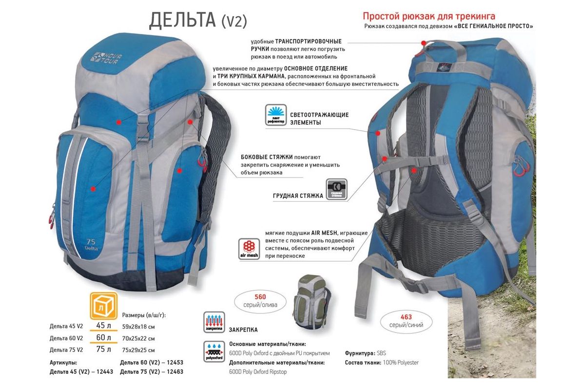 Рюкзак создавался под девизом «Все гениальное просто». Все необходимое снаряжение, и даже немного больше, поместится в увеличенное по диаметру основное отделение и три вместительных кармана, расположенных на фронтальной и боковых частях рюкзака. Комфорт при переноске обеспечивают мягкие подушки Air Mesh, играющие вместе с поясом роль подвесной системы. Если вам во время перехода потребуется снять верхнюю одежду, то её можно удобно нести перекинув через боковую стяжку рюкзака и быстро одеть если станет прохладнее. Вы не испытаете неудобств с погрузкой рюкзака в поезд или автомобиль благодаря удобным транспортировочным ручкам. На концах боковых стяжек имеются липучки для закрепления излишков стропы.