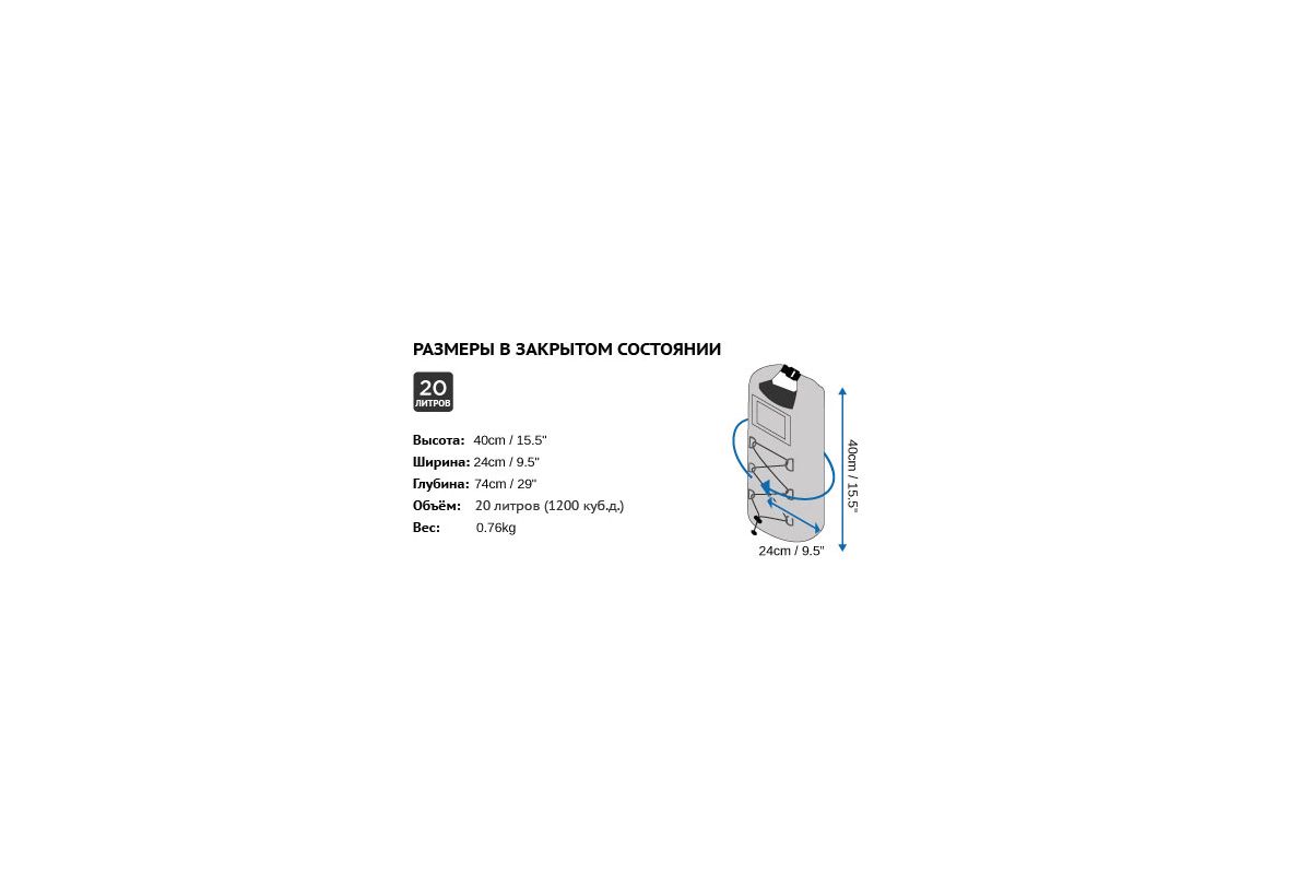 Размер: высота 400 мм, диаметр 240 мм, окружность 740 мм, объем 20 литров.