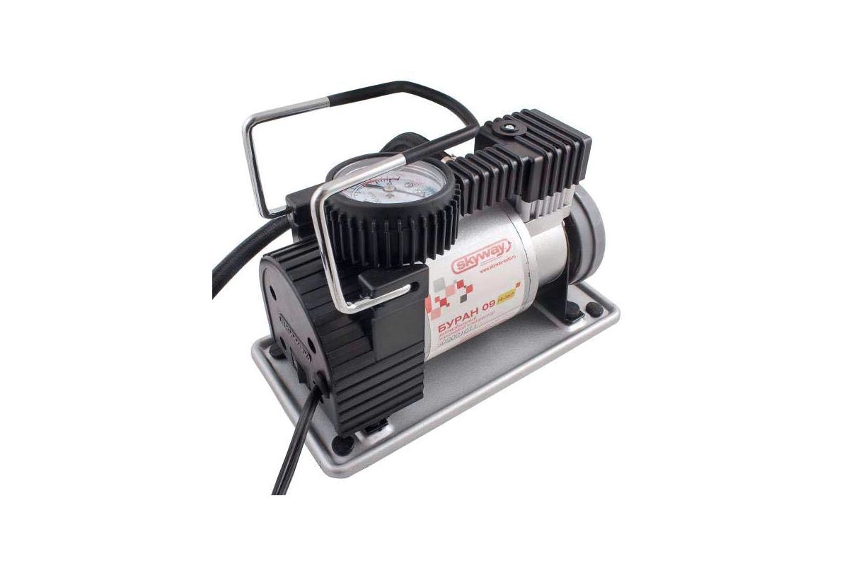 Металлический компрессор SKYWAY БУРАН-09 Hi-tech представляет собой удобное оборудование, которое необходимо перевозить в автомобиле. Дополнительные насадки расширяют стандартный комплект.