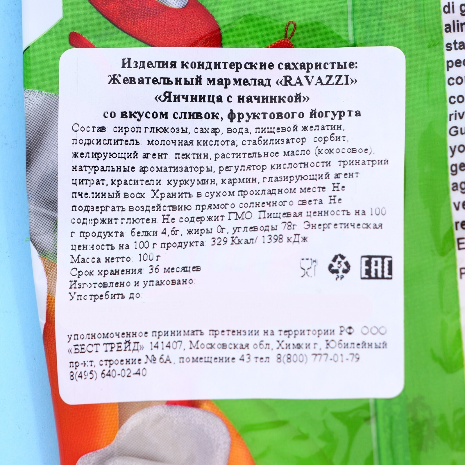 Жевательный мармелад RAVAZZI "Яичница с начинкой" - это нежный и мягкий мармелад весом 100 грамм. Он имеет яркий и привлекательный внешний вид благодаря своей яркой упаковке и приятной форме.