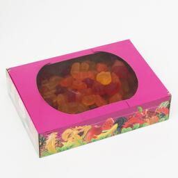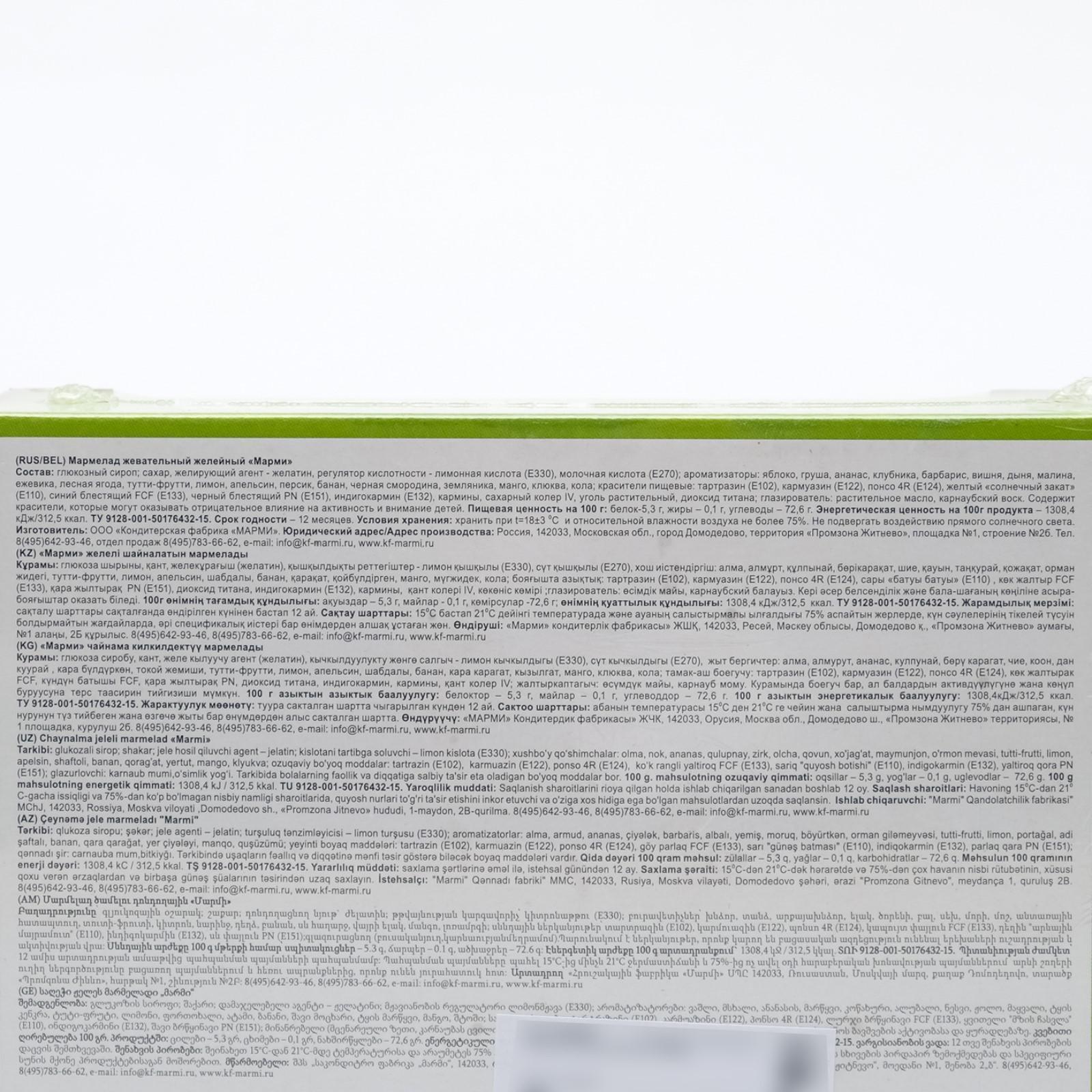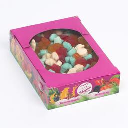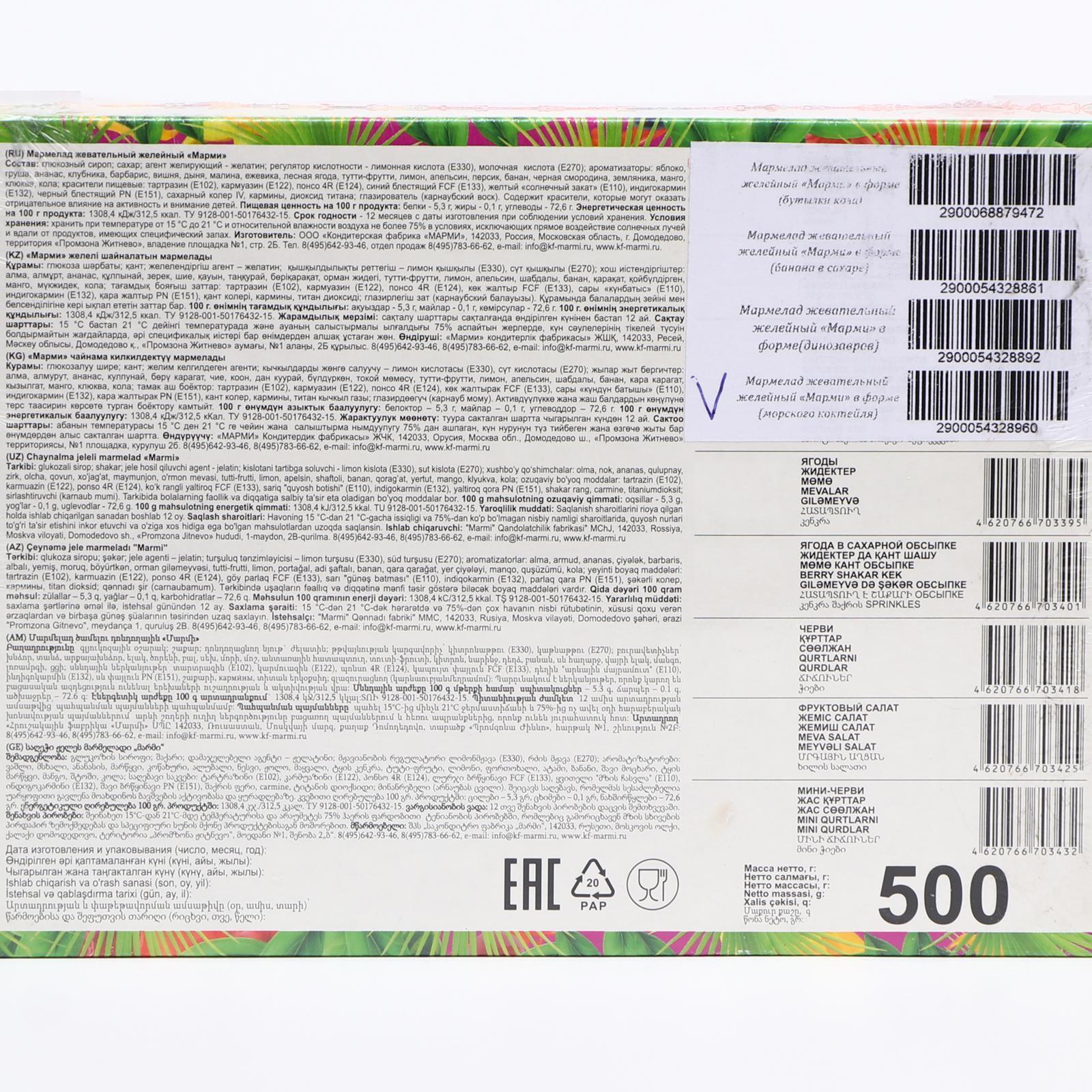 Состав: глюкозный сироп; сахар; агент желирующий: желатин; регулятор кислотности: лимонная кислота (Е330); ароматизаторы: банан, вишня, ананас, ежевика, апельсин; красители пищевые: тартразин (E102), желтый «солнечный закат» (Е110), кармуазин (Е122), диоксид титана (Е171), синий блестящий FCF (Е133); глазирователь: карнаубский воск, растительное масло.