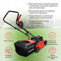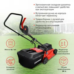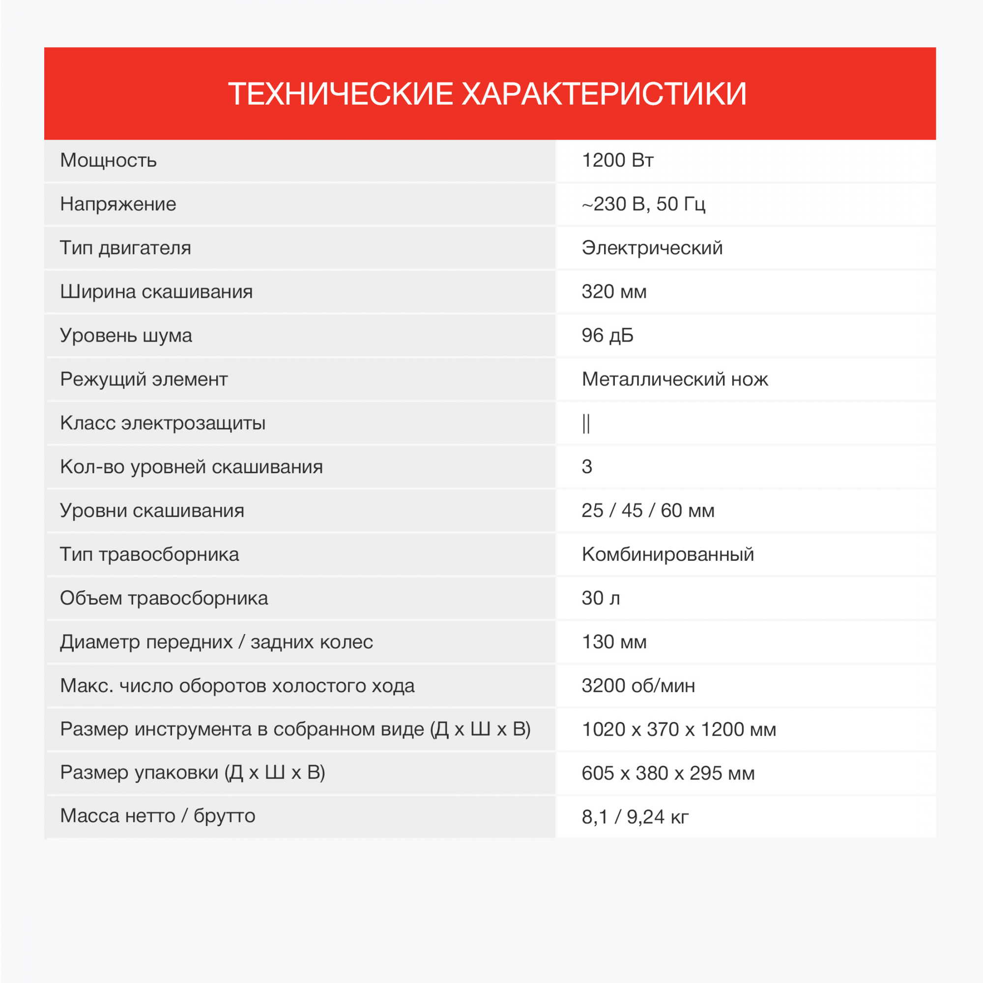 • Комплект поставки Газонокосилка, травосборник, рукоятка, комплект крепежа