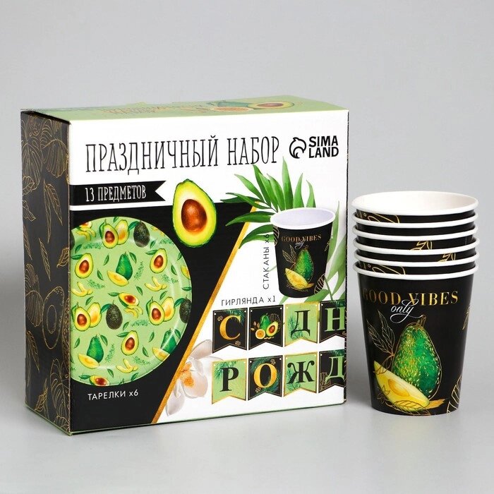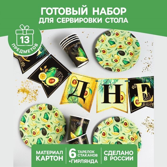 Набор бумажной посуды "Авокадо", 6 тарелок, 6 стаканов, 1 гирлянда