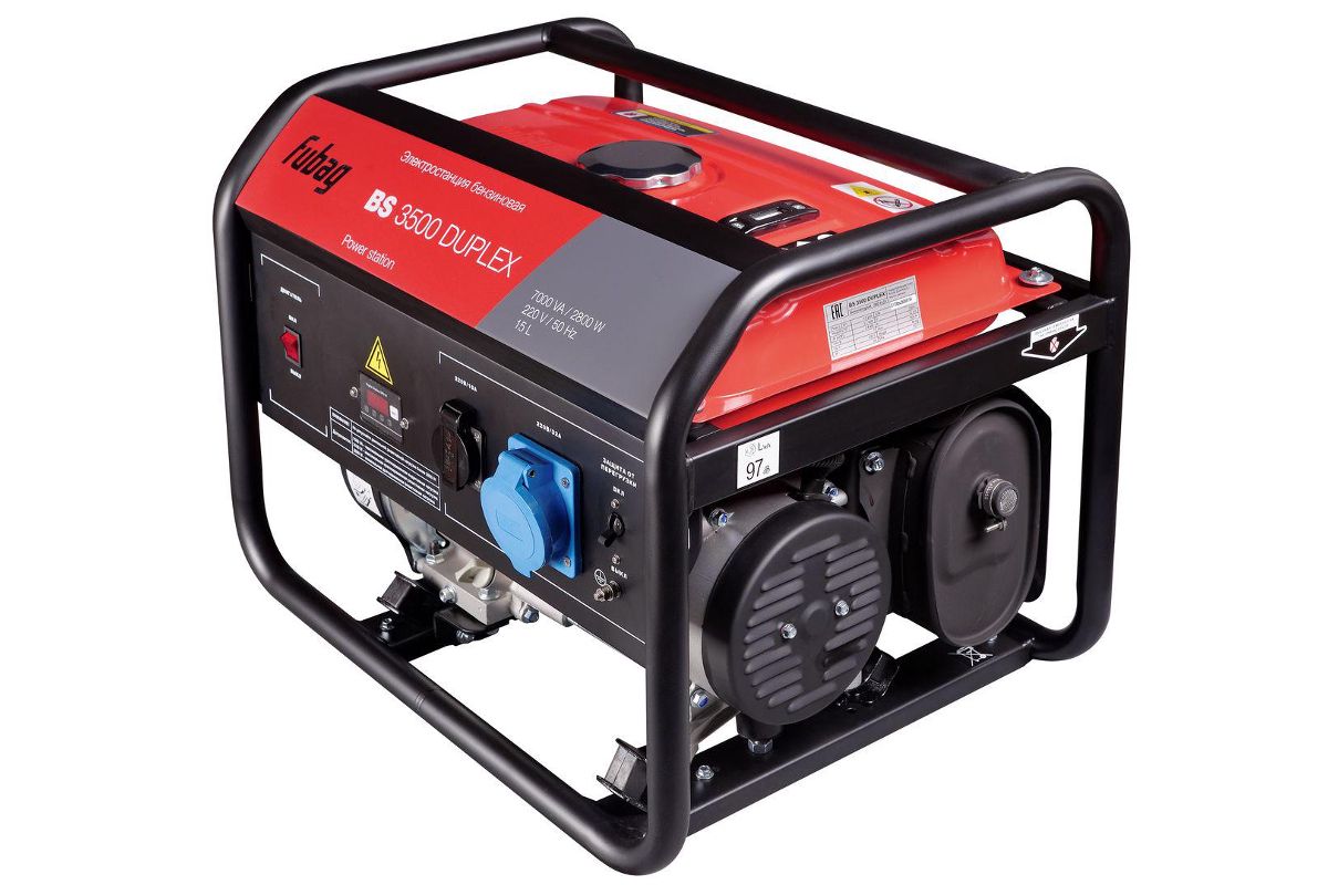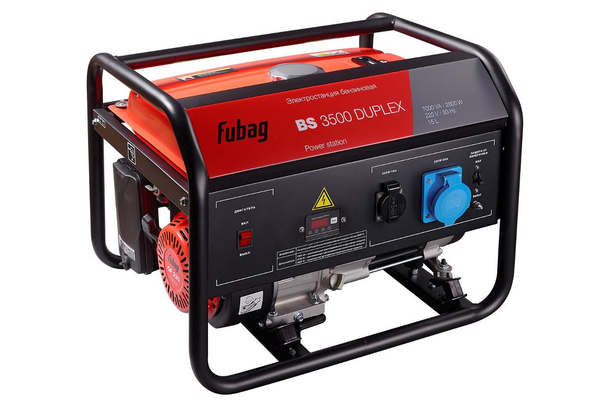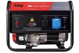 Бензиновый генератор FUBAG BS 3500 Duplex предназначен для аварийного или основного электрообеспечения  загородного дома, строительной площадки и т.д. Активная мощность – 2800 Вт. Выходной ток – 25 А. Достаточно для запитывания строительных инструментов, бытовой техники и освещения. Подойдёт для работы с компрессорами, насосами, перфораторами, теплопушками и т.д.