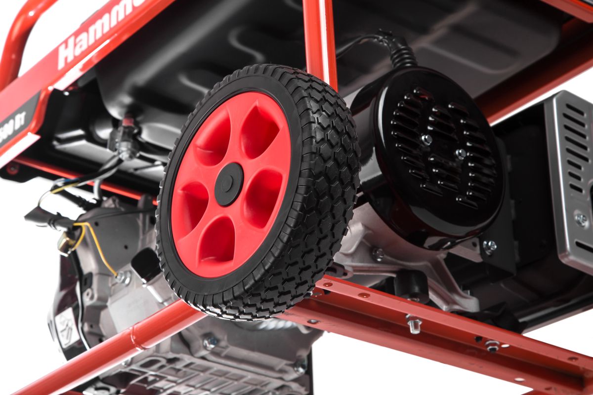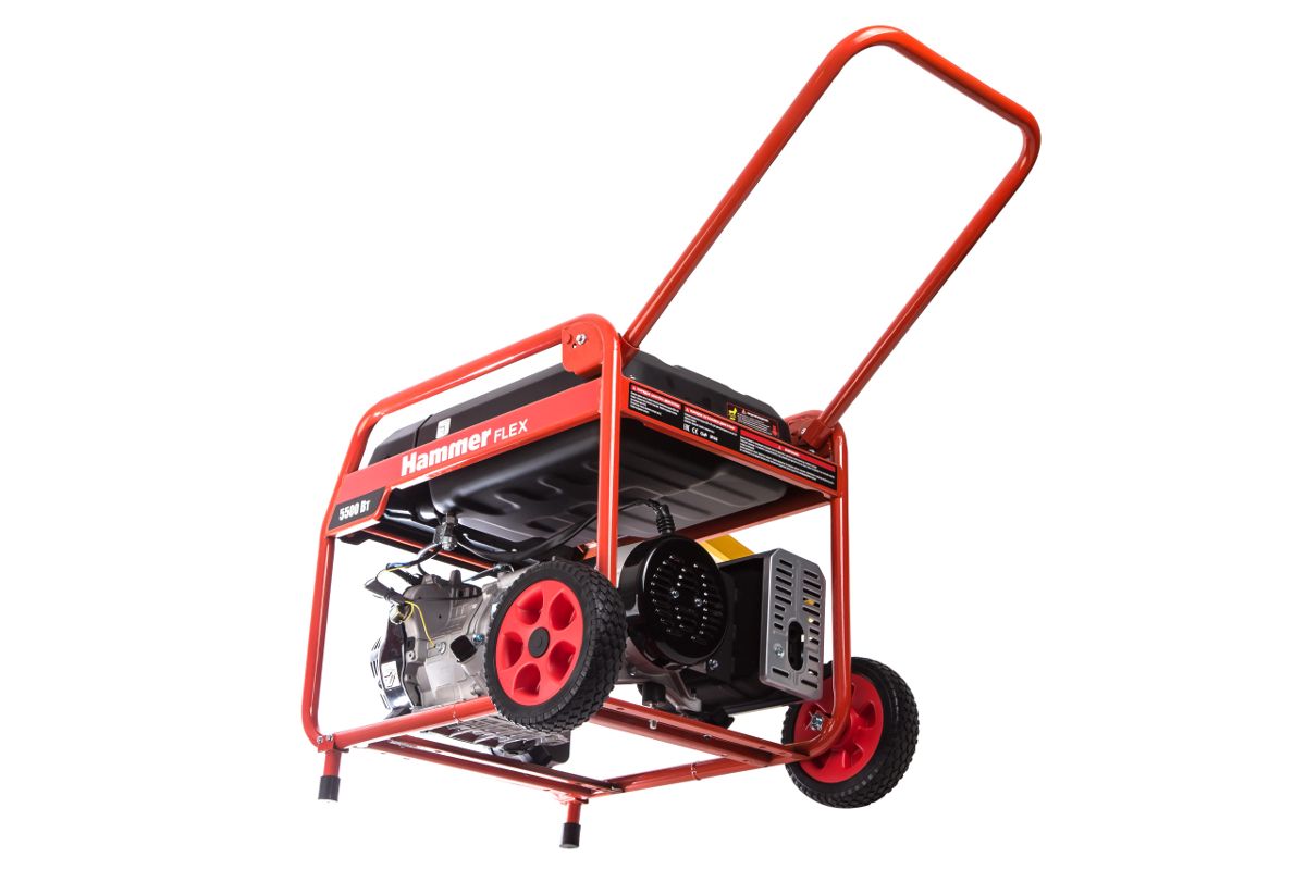 Бензиновый генератор Hammer Flex GN6000T обеспечивает качественное питание электроинструментов, бытовой техники и прочих потребителей суммарной мощностью до 5,5 кВт. Для удобства транспортировки в комплекте имеются колеса и ручка.