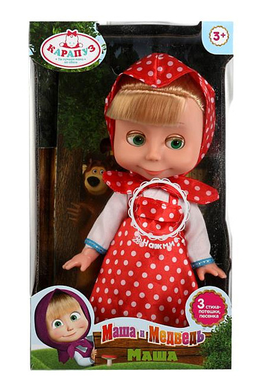 Кукла «Маша», персонаж мультсериала «Маша и Медведь» ТМ «Карапуз» - озвученная игрушка, которая поёт песенку "Про следы" и рассказывает 3 стиха-потешки ("Каша", Каравай", "Мишка косолапый"). Нажмите кнопку на животике.