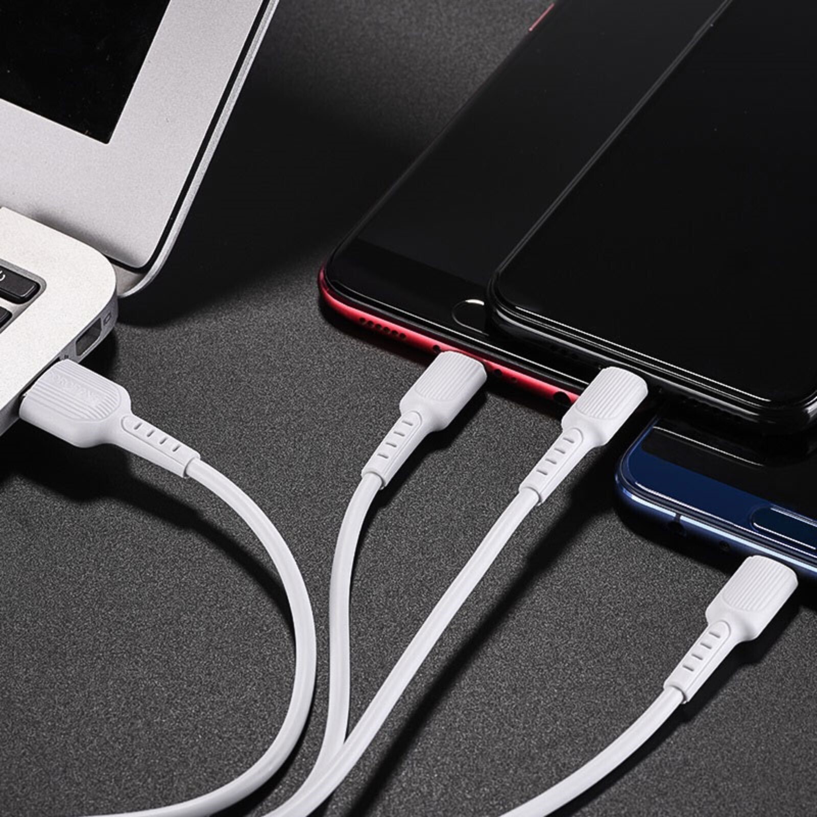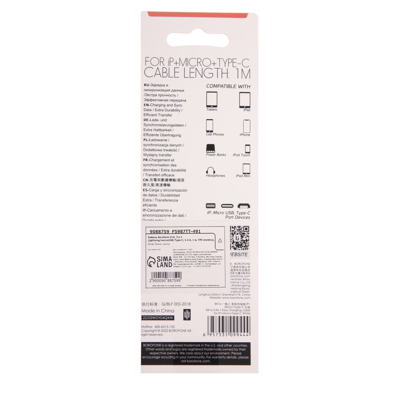 Кабель Borofone X16, 3 в 1 Lightning/microUSB/Type-C, 2.4 А, 1 м, TPE оплётка, белый