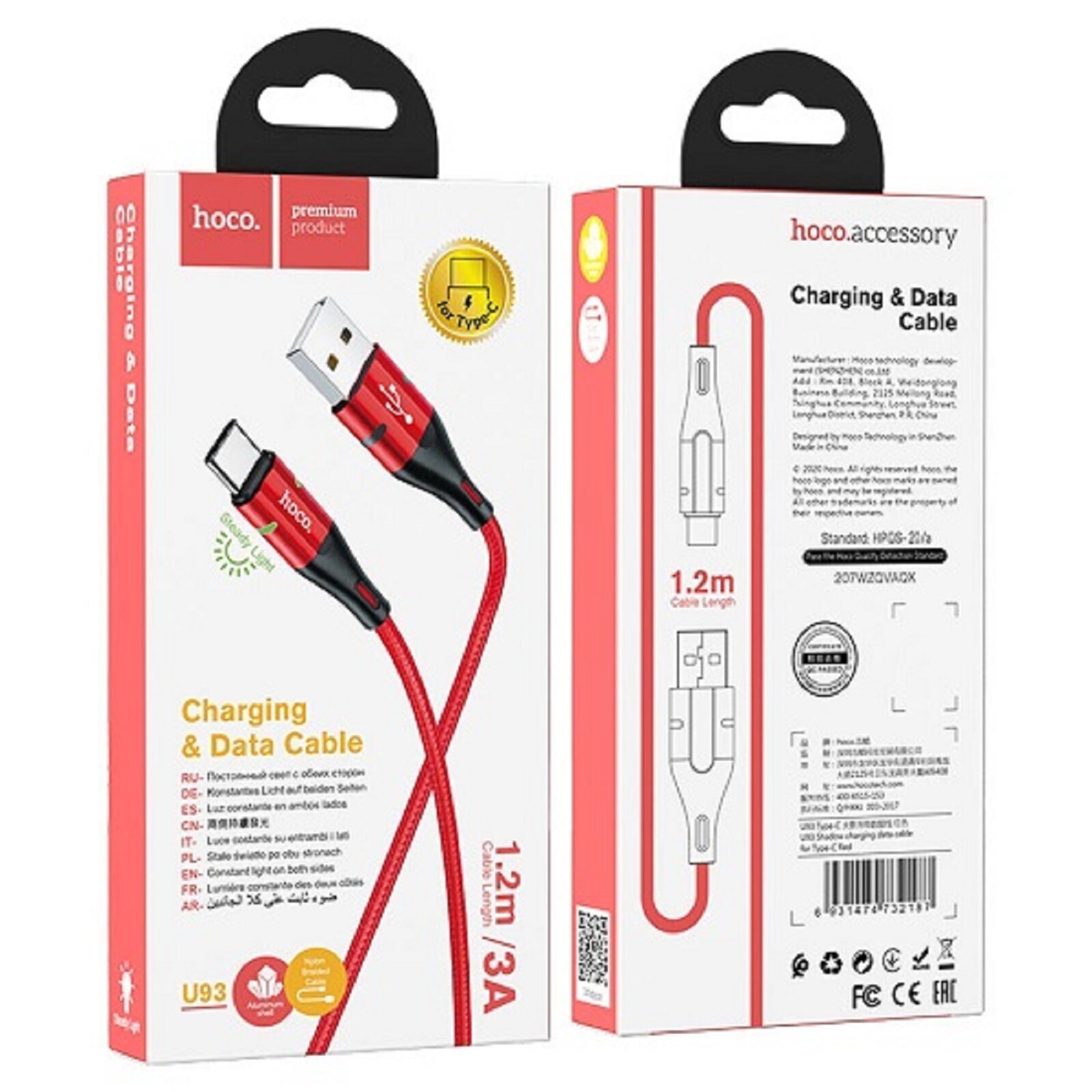 Кабель Hoco U93, USB - Type-C, 3 А, 1.2 м, индикатор, красный
