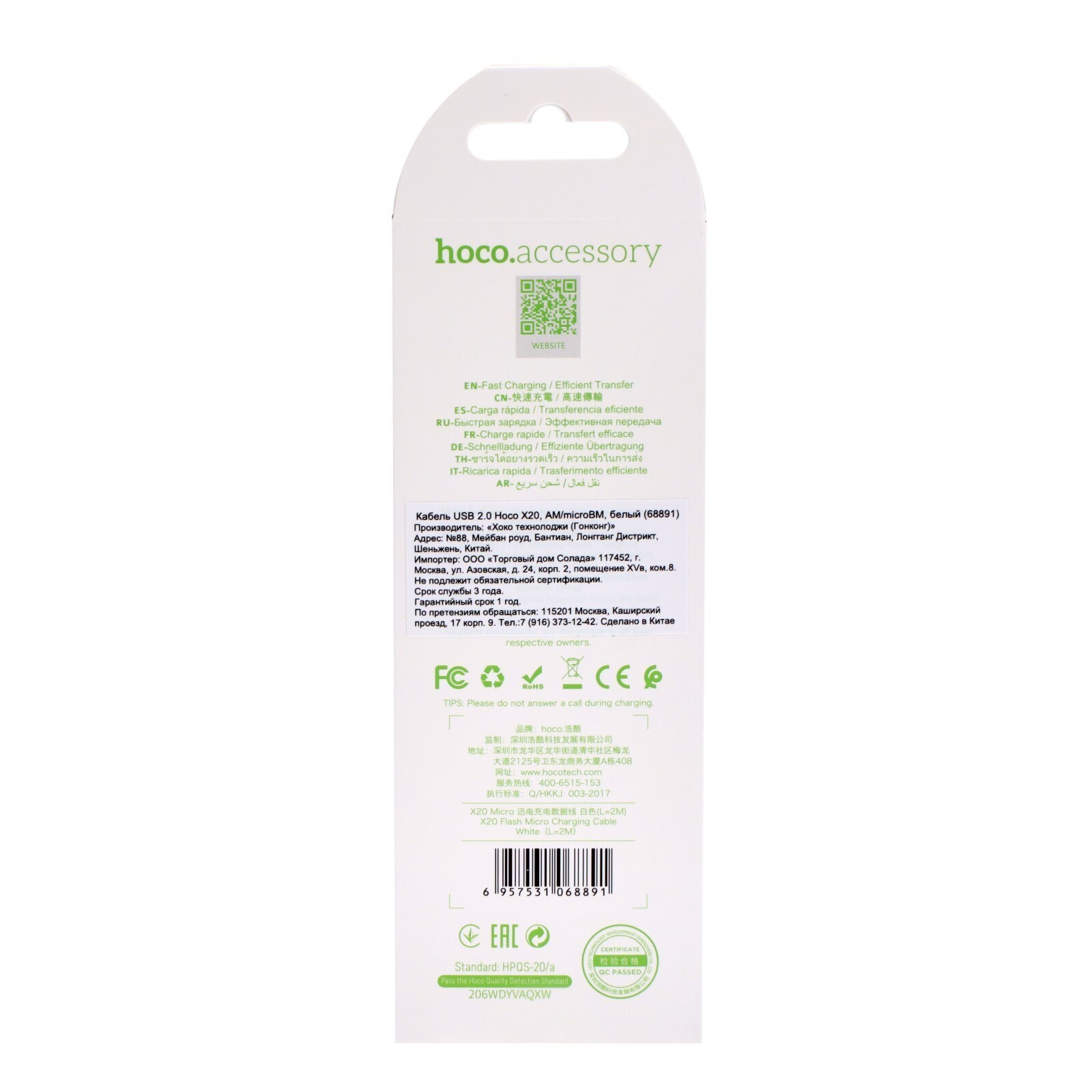 Кабель Hoco X20, microUSB - USB, 2 А, 2 м, PVC оплетка, белый