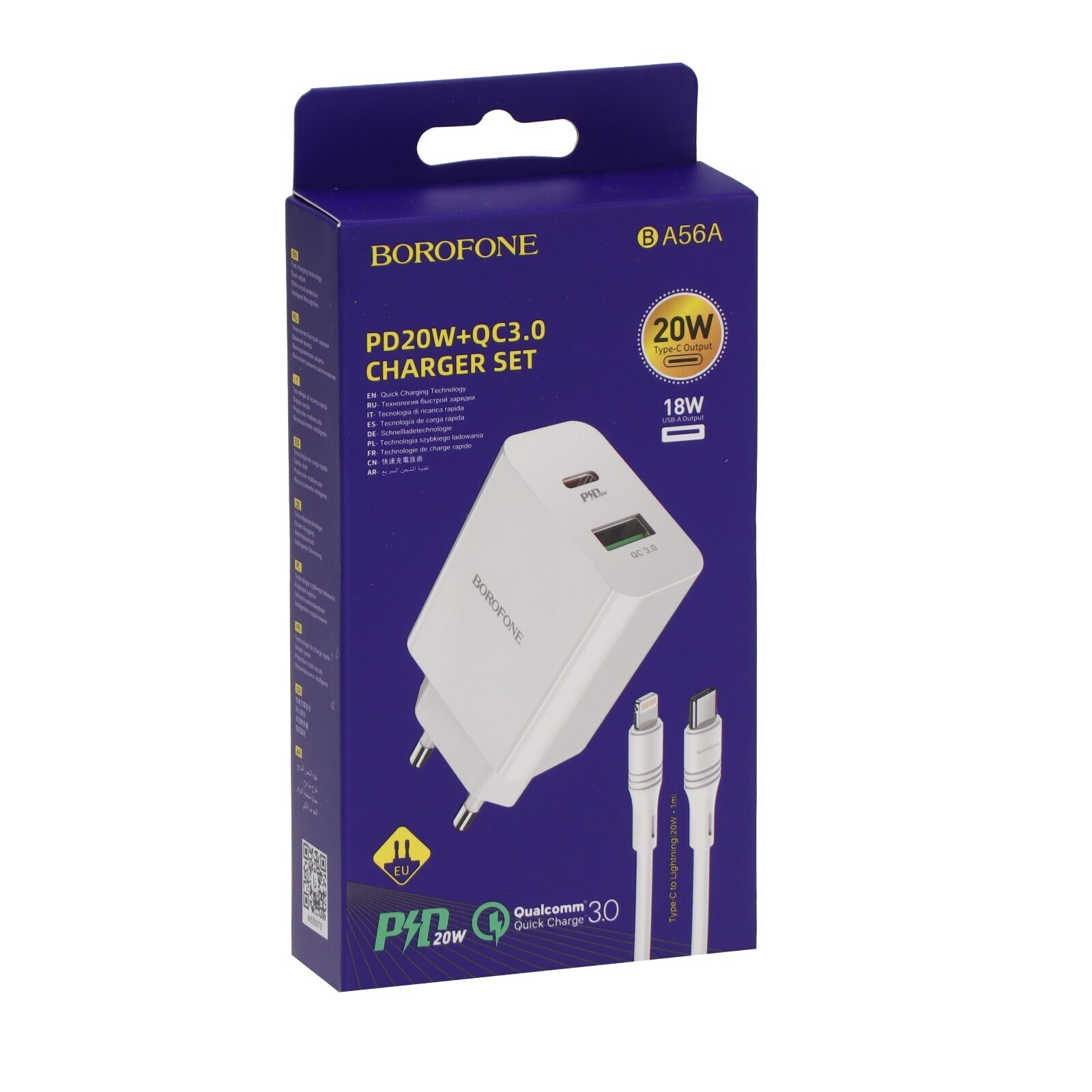 Сетевое зарядное устройство Borofone BA56A, PD20W + QC3.0, 3 А, Type-C - Lightning, белое