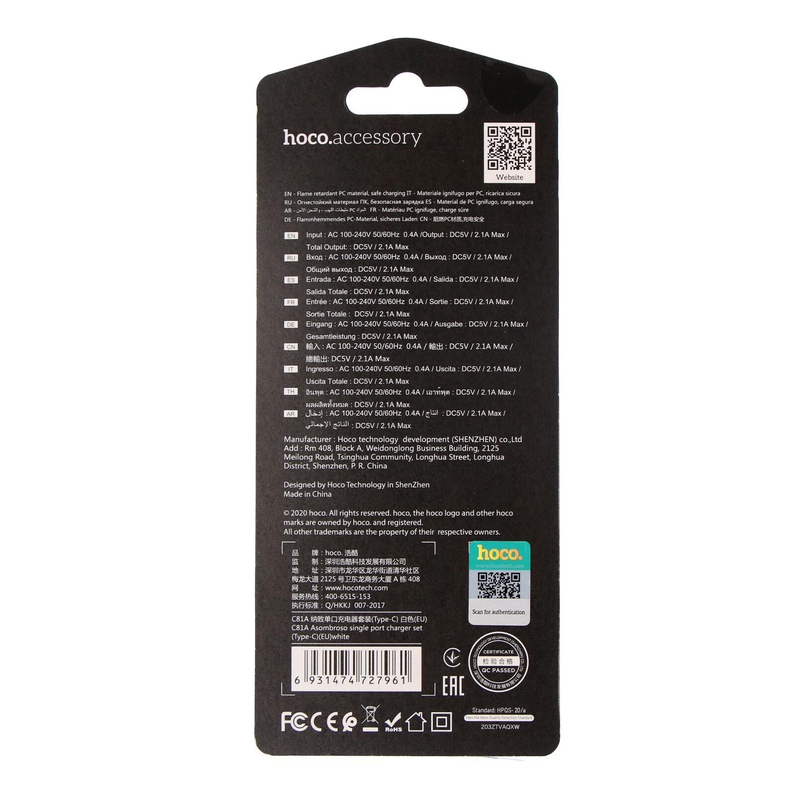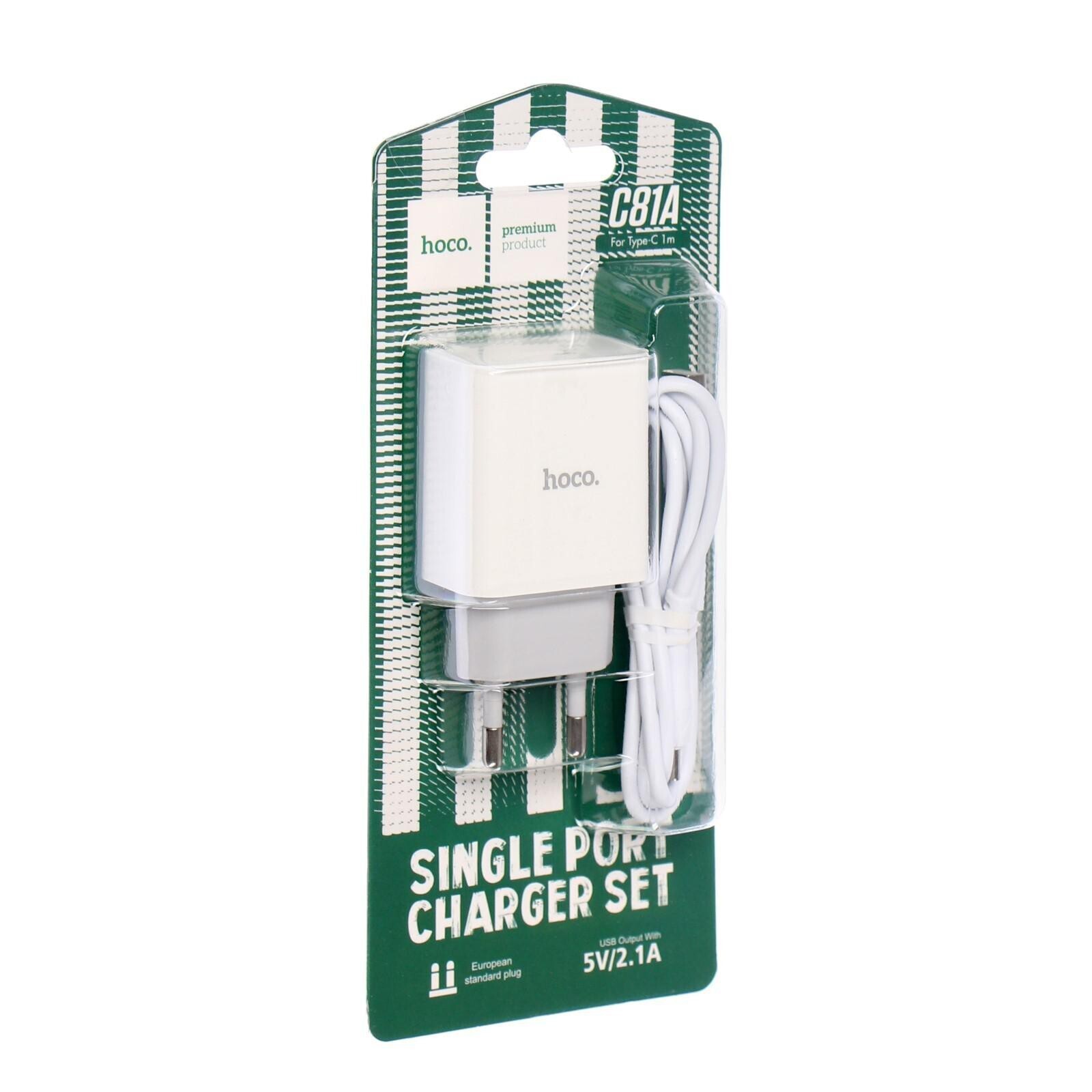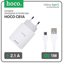 Сетевое зарядное устройство Hoco C81A, USB, 2.1 А, кабель Type-C 1 м, белый