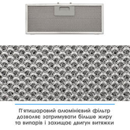 Надійний 5-шаровий алюмінієвий фільтр поглинає жир, бруд, дрібні сторонні частинки й захищає двигун витяжки. Для легкого очищення його достатньо вийняти і помити в гарячій воді чи посудомийній машині.