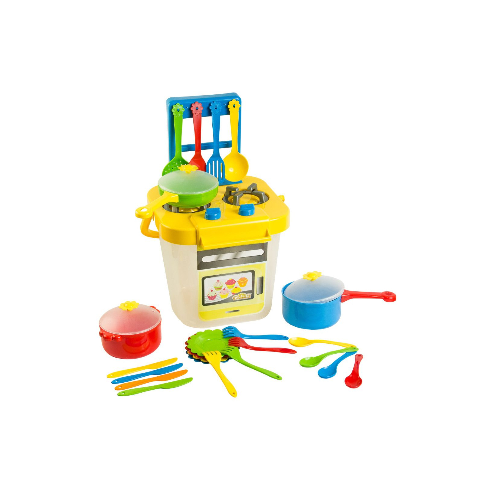 Іграшкова посудка з плитою Ромашка включає чудову газову плиту з двома конфорками, підставкою під кухонне приладдя і відерце, яке імітує духовку. Навпроти кожної конфорки є вмикач, повернувши його, чується клацання. Крім того, набір також включає каструлю, 2 сковорідки зі знімними ручками, ополоник, шумівку, 2 лопатки і тарілки, ножі, виделки, ложки на 4 персони. Вся посудка складається в прозоре відерце, яке має зручну ручку для перенесення всього набору. Таким чином, їм буде зручно грати як вдома, так і у дворі.