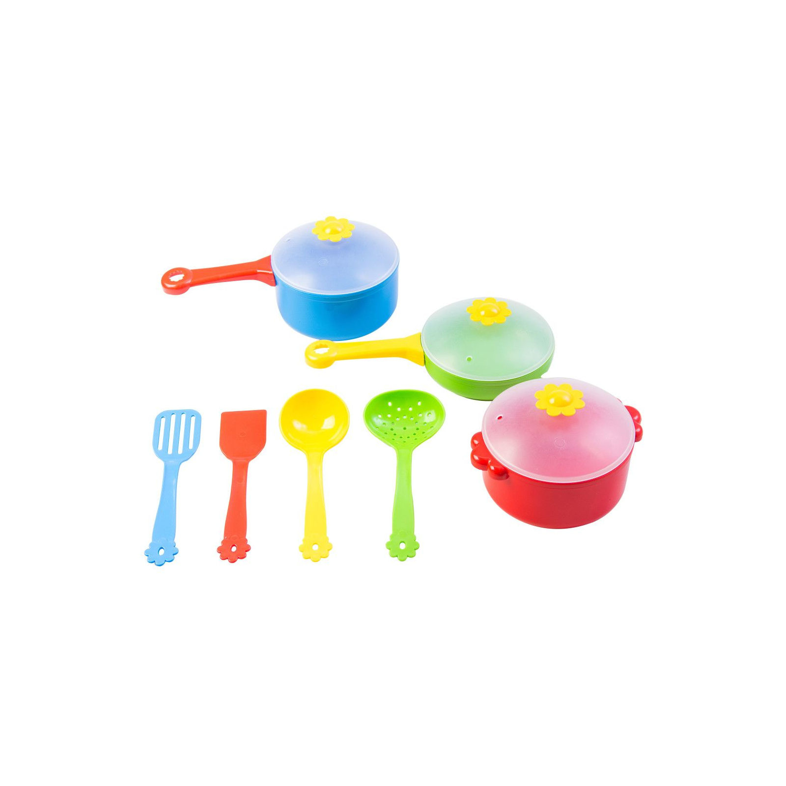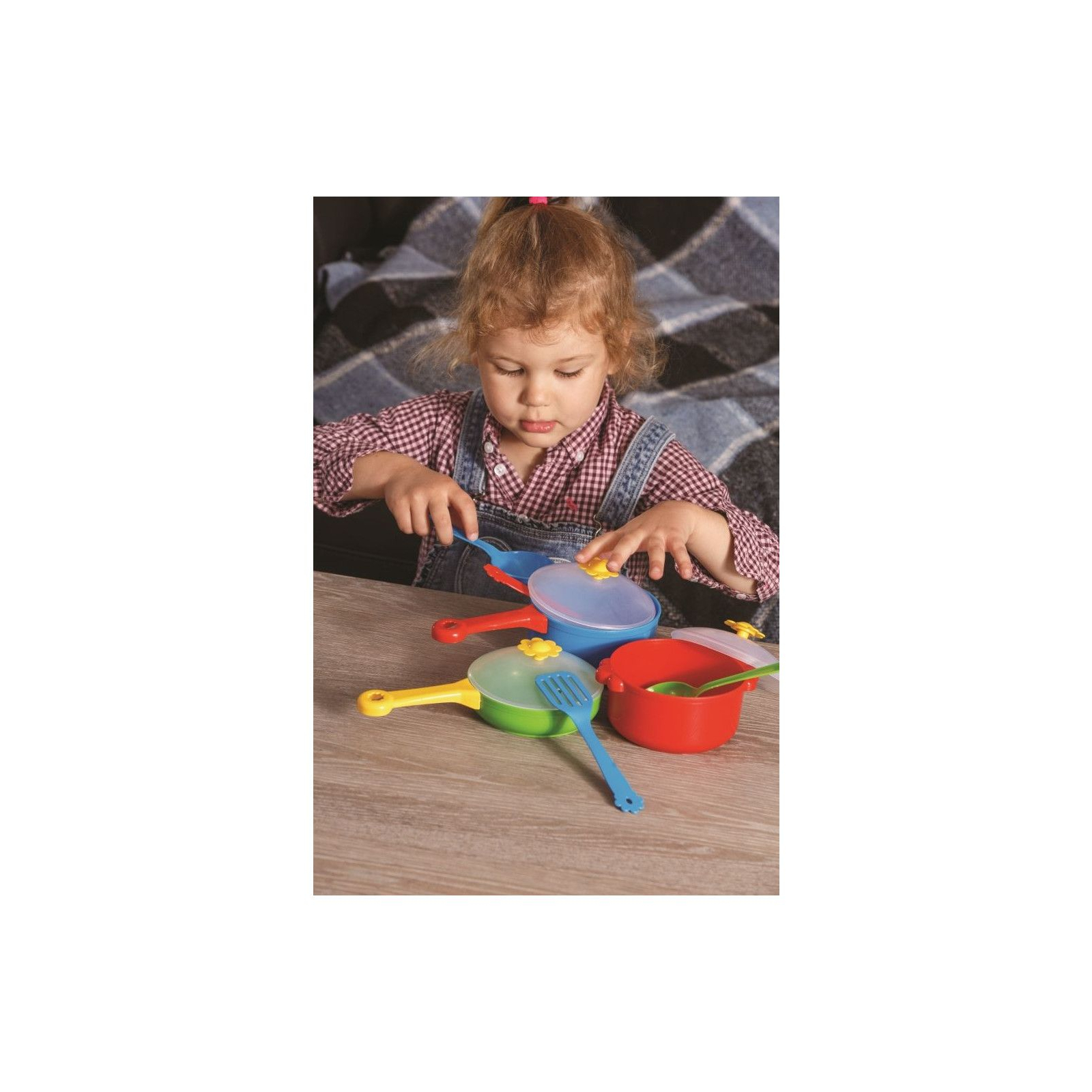 Набір іграшкового посуду столовий «Ромашка» з 10 елементів дасть можливість будь-якій дівчинці відчути себе шеф-кухарем. За допомогою сковорідок 2 видів, каструлі, двох лопаток, шумівки і ополоника вона зможе приготувати справжній бенкет. Ручка з пательні знімається, перетворюючи її в зручне блюдо для випічки.