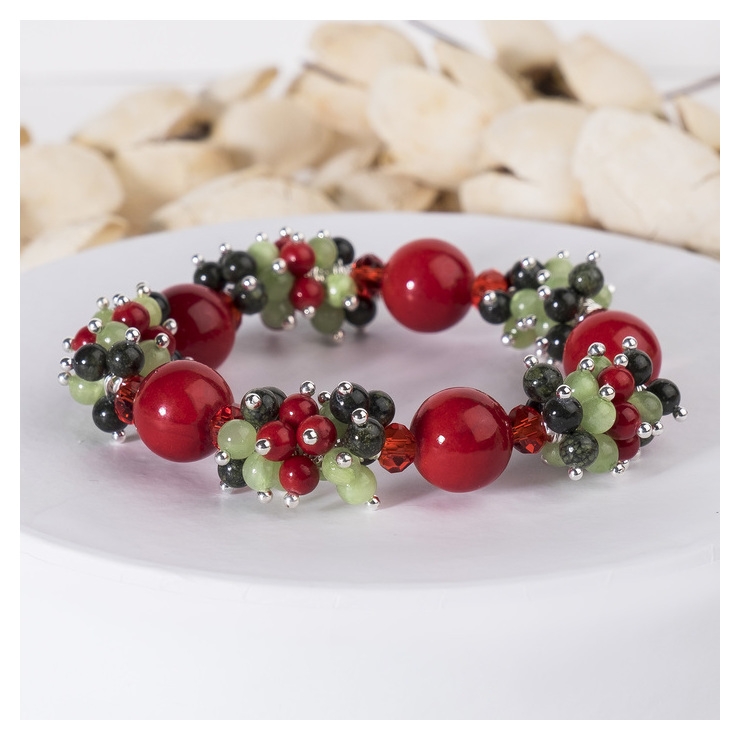 Браслет шар №10 "Коралл" с шариками №4 оникса, змеевика и хрусталём