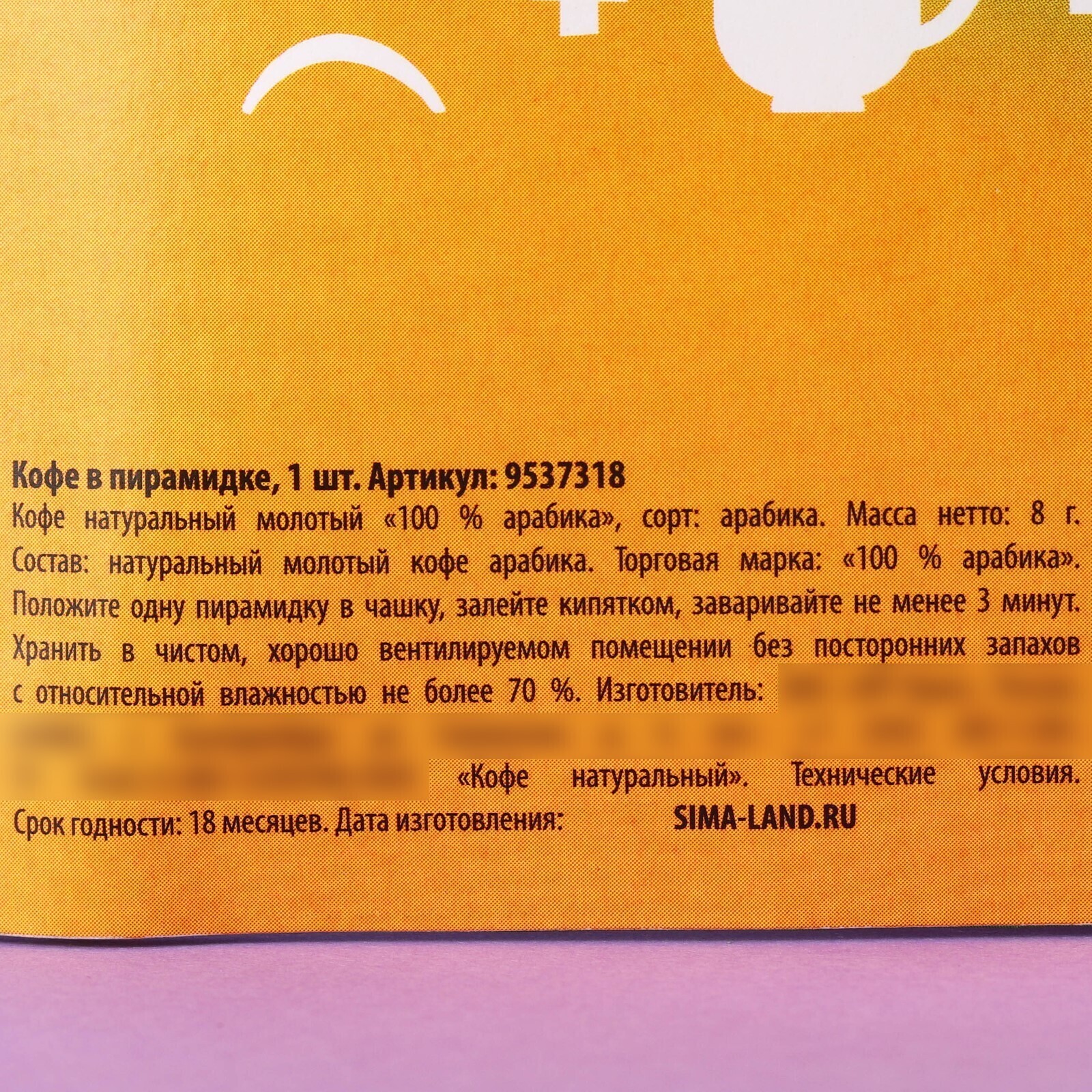 Состав: кофе натуральный жареный молотый ( сорт: арабика), ароматизатор пищевой.