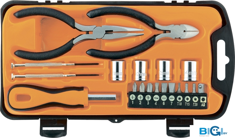 - Комплектация - длиногубцы,- бокорезы,- отвертка,- переходник, - две часовые отвертки,- торцевые головки 11, 12, 13, 14 мм,- биты PH 1, PH 2 PZ 1, PZ 2, SL 4, SL 5, SL 6, T 10, T 15, T 20.