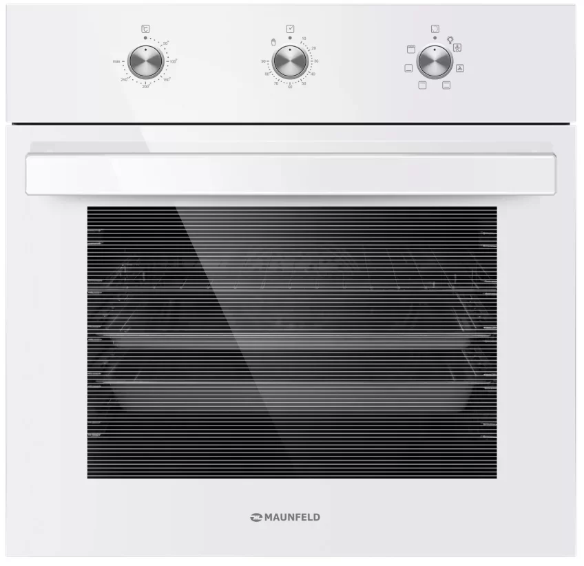 Maunfeld CEOF.656W — электрическая духовка с грилем и конвекцией. Модель поддерживает 7 рабочих режимов и снабжена механическим таймером для контроля времени приготовления. Поворотные регуляторы можно зафиксировать внутри панели управления, что исключает случайное изменение настроек и создает удобство при очистке фронтальной поверхности шкафа.