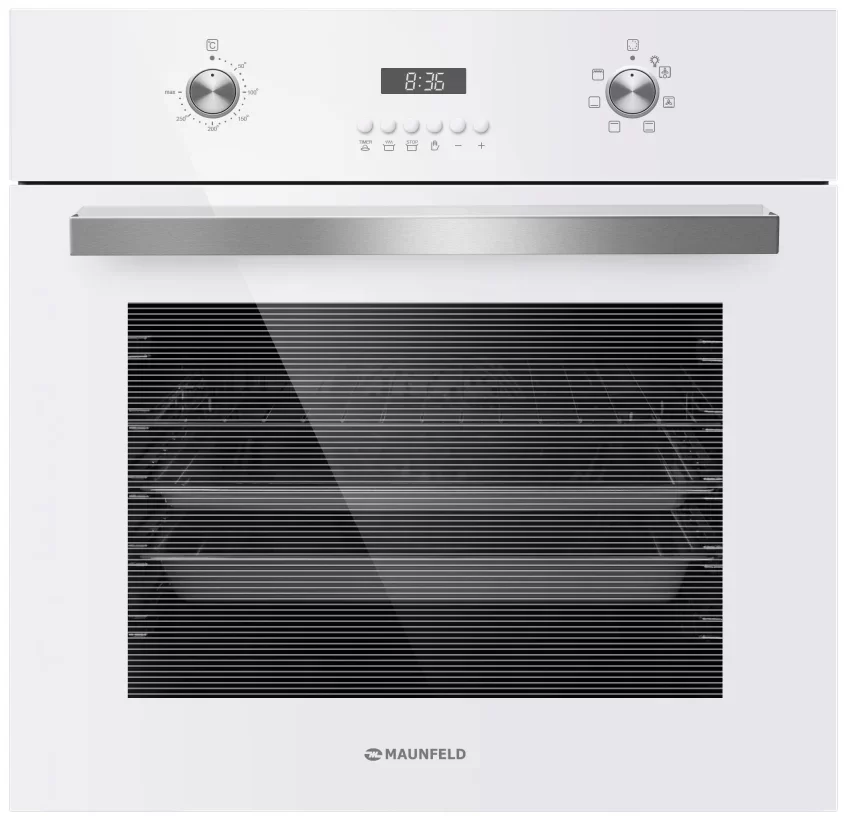 Maunfeld CEOD.656W — белый духовой шкаф с рабочей камерой объемом 65 литров. Модель поддерживает 7 режимов нагрева, выбор которых осуществляется при помощи утапливаемых регуляторов. Панорамное стекло Smart Eye и подсветка внутреннего пространства позволяют проконтролировать весь процесс приготовления.