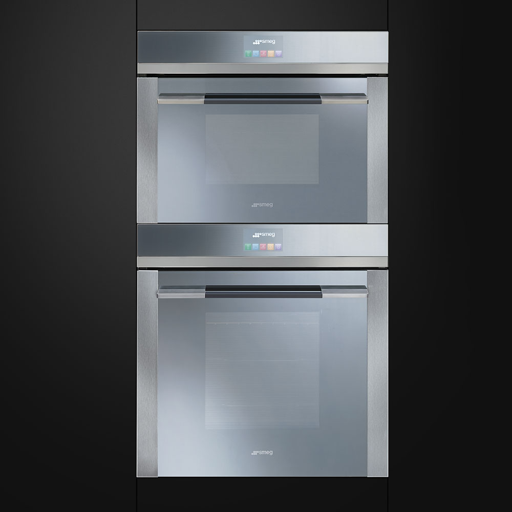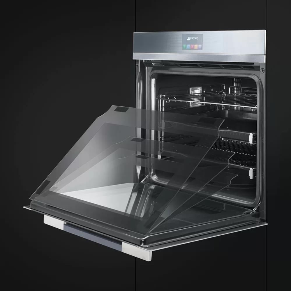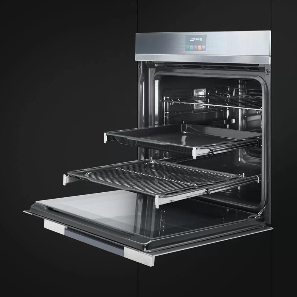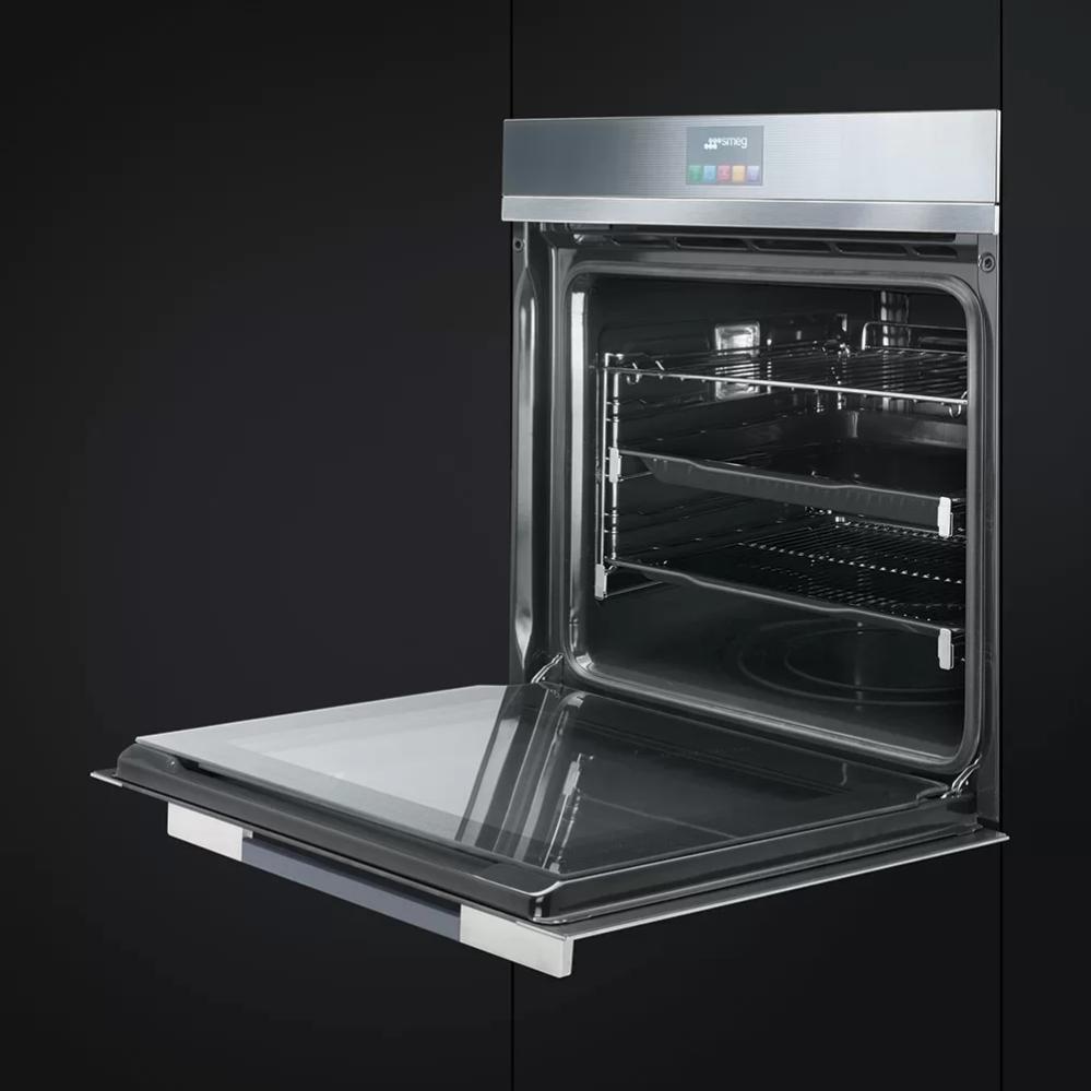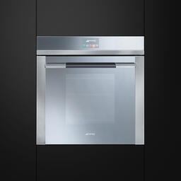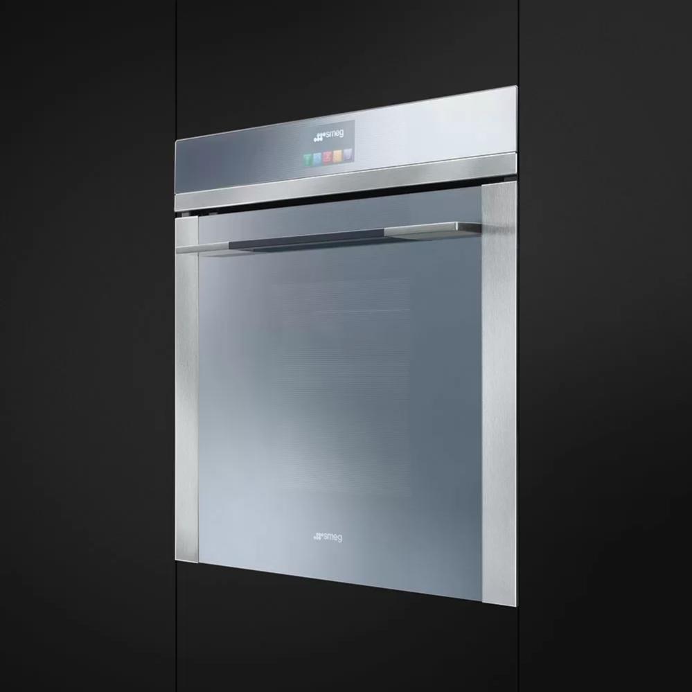 Эффектный духовой шкаф Smeg с отделкой серебристым стеклом Stopsol и нержавеющей сталью. Вместительный духовой шкаф с 50 автоматическими рецептами приготовления и возможностью сохранять до 10 своих личных программ.