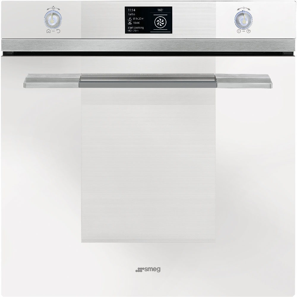 Элегантный и функциональный духовой шкаф Smeg. Фасад из белого стекла гармонично дополнит интерьер кухни. Поворотные переключатели из поликарбоната с подсветкой и графический TFT-дисплей позволят с легкостью выставить необходимые настройки и проконтролировать все текущие процессы.