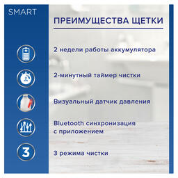 Электрическая зубная щетка Oral-B Smart 4 рекомендована всем, кто хочет сменить мануальную зубную щетку на электрическую и улучшить здоровье своих зубов и десен. Щетка подключается к приложению Oral-B в вашем телефоне и направляет вас в режиме реального времени для достижения наилучшего результата. Пока вы совершенствуете процесс чистки зубов, уникальная круглая насадка Oral-B делает все остальное. Она удаляет до 100 % больше зубного налета, чем обычная мануальная зубная щетка, делая десны более здоровыми, а вашу улыбку — белоснежной, благодаря удалению пигментированного зубного налета начиная с первого дня чистки. Кроме того, зубная щетка защищает чувствительные десны при помощи запатентованной технологии с датчиком давления, который снижает скорость чистки и визуально предупреждает, когда вы давите слишком сильно.