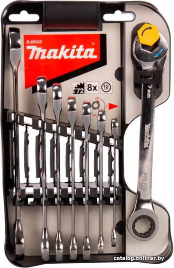 - Комплектация Храповик имеет 72 зубца на закрытой стороне. 8 ключей имеют размеры: 8, 10, 12, 13, 14, 15, 17 и 19 мм.