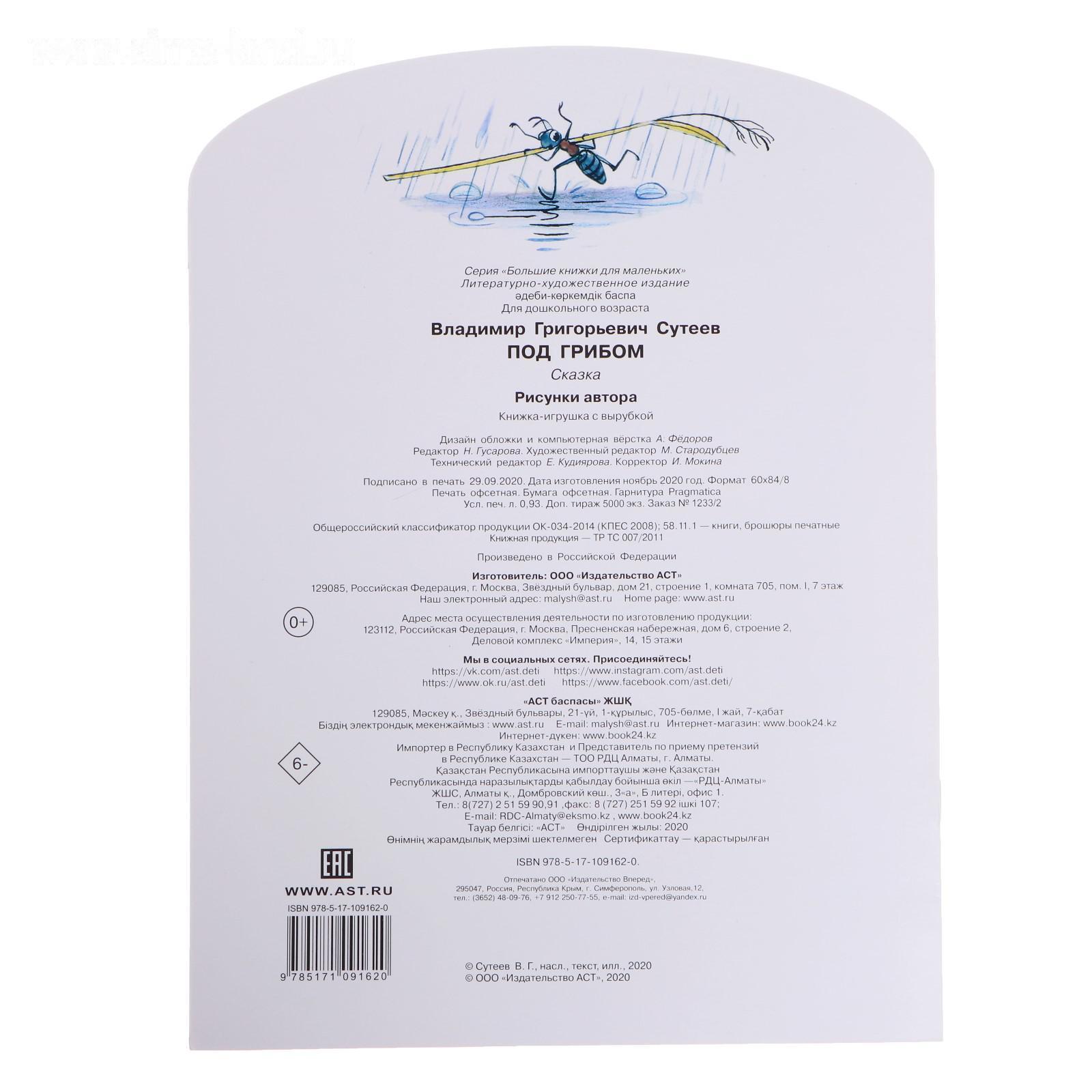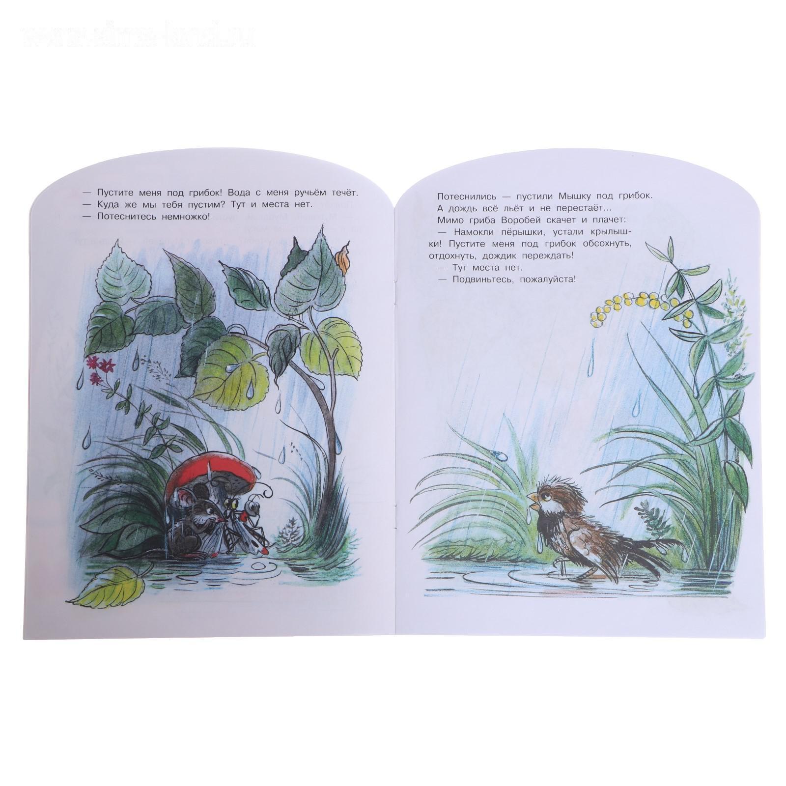 Как-то раз застал Муравья сильный дождь. И спрятался он под маленьким грибком. Не успел дождь пройти, а под шляпкой гриба оказалась целая компания зверят — и Бабочка, и Мышка, и Воробей, и даже Заяц! Как все они поместились Под грибом? Читай сказку и найдёшь ответ!