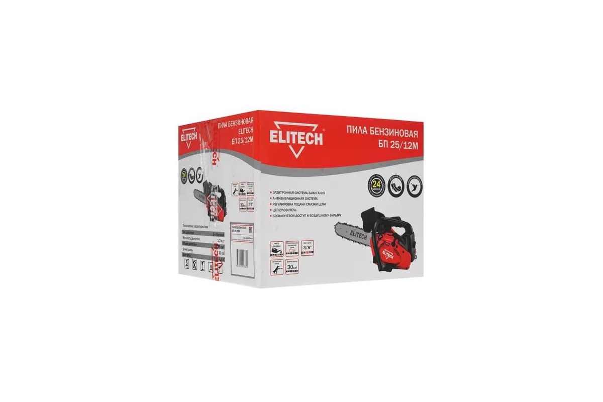 ELITECH БП 25/12 М – бытовая садовая бензопила. Подходит для обрезки веток, подравнивания крон, спилки молодых деревьев. Мощность двигателя – 1,2 л.с.