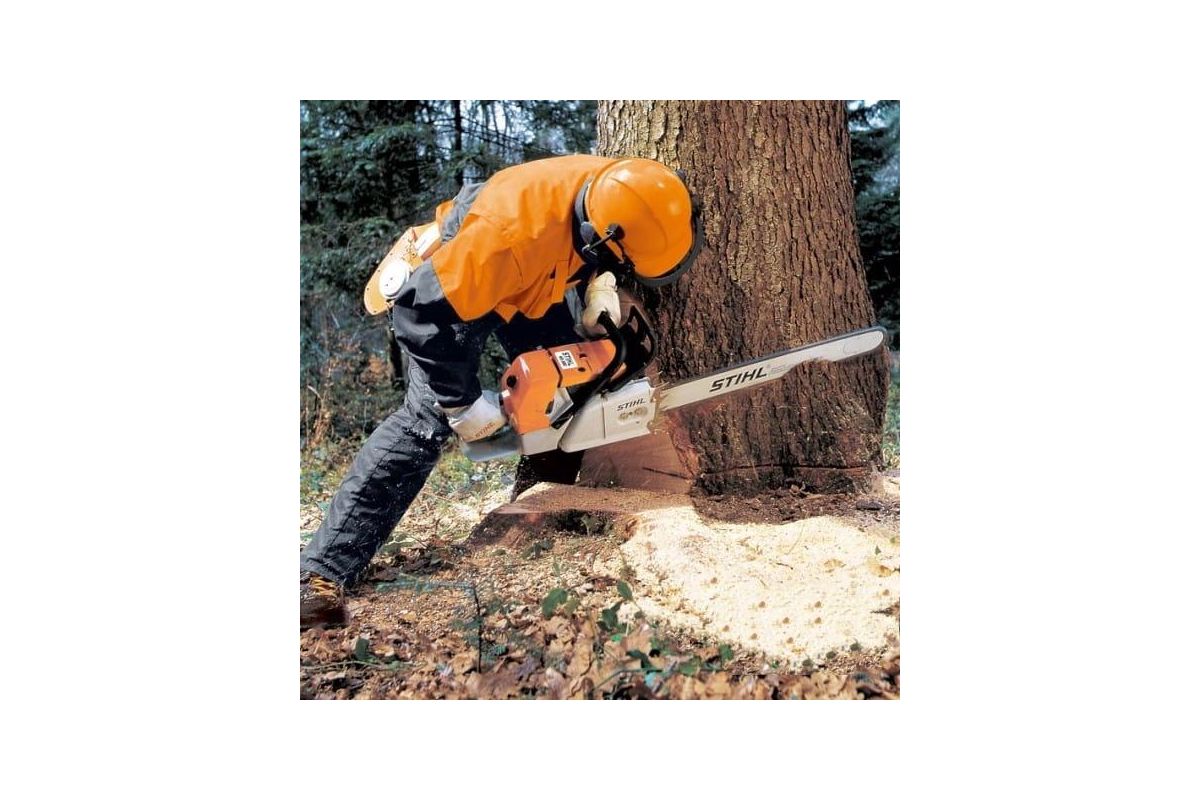 Бензопила Stihl MS 880 рассчитана на выполнение максимально сложных задач и это сказывается на ее весе: эта модель весит почти 10 килограммов. Данная бензопила поставляется с пильной шиной длиной 75 сантиметров. С шиной такой длины пользователь легко распилит дерево любого диаметра. При желании пользователь сможет использовать и другие шины длиной от 43 до 150 сантиметров. Так как одним из важнейших аспектов при работе с режущим инструментом являестя безопасность пользователя, эту модель оборудовали тормозом цепи «QuickStop», который быстро срабатывает и защищает пользователя от случайных травм. Еще одной особенностью, способствующей повышению безопасности являестя устройство для бокового натяжения цепи, которое дает пользователю возможность настраивать цепь, не касаясь ее.
