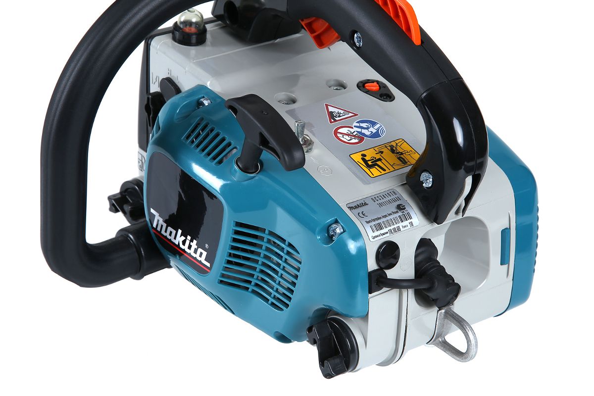 Пластиковый корпус бензопилы Makita DCS3410TH оснащен двумя ручками, размещенными перпендикулярно друг к другу. На обеих рукоятках имеются специальные мягкие накладки, препятствующие выскальзыванию инструмента из рук. Для сокращения уровня вибрации обе рукоятки подпружинены. Напротив передней ручки пилы установлен защитный щиток. Помимо защиты руки он отвечает за срабатывание тормоза аварийной остановки цепи. Данная модель пользуется тормозом двойного действия. Такой тормоз срабатывает инерционно (при отскоке пилы от материала) или при намеренном нажатии на щиток.