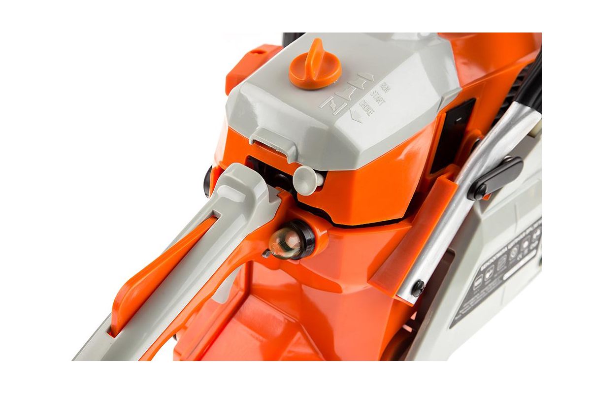 Передний щиток прервёт вращение цепи при нажиме. Предотвратит попадание руки на острую часть бензопилы в случае внезапного толчка.